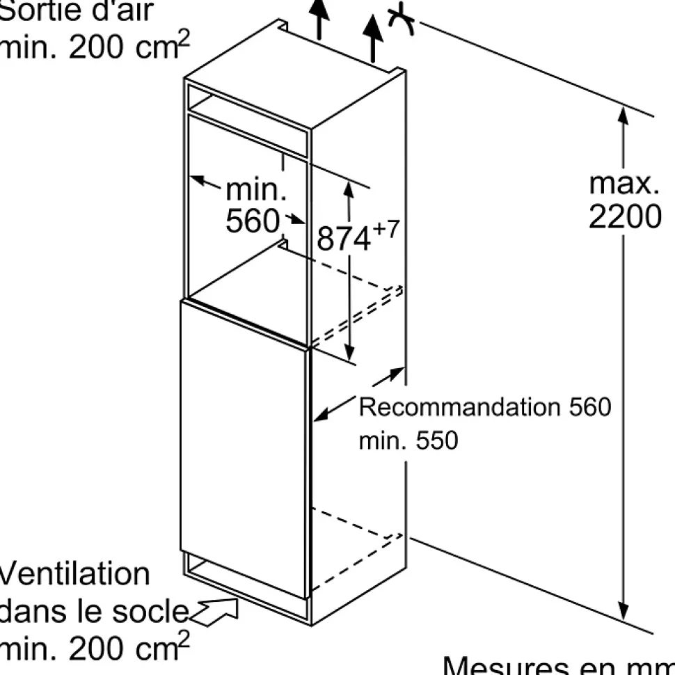 Congélateur intégrable à pantographe 96 l Siemens – Congélateur intégrable iQ500 Siemens GI21VADE0.Un appareil tapissé de givre et de glace consomme plus d’énergie : grâce à la technologie lowFrost l?évaporateur étant directement moulé dans la cuve, l?accumulation de glace est moindre. Non seulement la formation de glace est sensiblement plus faible et plus homogène, mais le dégivrage lui-même est beaucoup plus rapide que sur les appareils traditionnels.Qui n’a pas déjà mal refermé la porte du réfrigérateur ou du congélateur. Heureusement, le système de fermeture douce assistée softPull veille à la bonne fermeture de la porte. Un amortisseur est en outre intégré dans toutes les charnières plates. Ainsi, même si l?habillage de la porte est très lourd, elle se refermera facilement et sûrement pendant toute la durée de vie de l’appareil. – Type de produit : Congélateur intégrable.Volume total : 96 l.Classe d’efficacité énergétique : E.Consommation énergétique : 176 kWh/an.Technologie lowFrost – moins de glace, dégivrage rapide.Fixation de porte à pantographe.Régulation électronique avec affichage LED de la température.Super-congélation avec arrêt automatique.FreshSense : température constante par technologie de capteurs intelligents.Alarme sonore de température, Alarme visuelle.Autonomie en cas de coupure électrique : 13 h.3 tiroirs de congélation transparents, dont 1 bigBox.Pouvoir de congélation en 24h : 5 kg.Puissance de raccordement (W) : 90.Classe climatique : SN-T.Niveau sonore : 36 DB.Classe d’efficacité sonore : Classe sonore_Eu19: C.Charnières à droite, réversibles.Type d’installation : App. encastrable, intégrable.Type de commandes : Electronique.Puissance de raccordement (W) : 90.Longueur du cordon électrique (cm) : 230.Intensité (A) : 10.Fréquence (Hz) : 50.Tension (V) : 220-240.Largeur appareil (mm) : 558.Hauteur appareil
