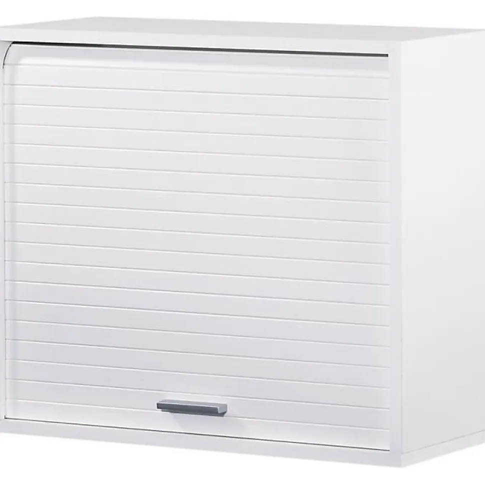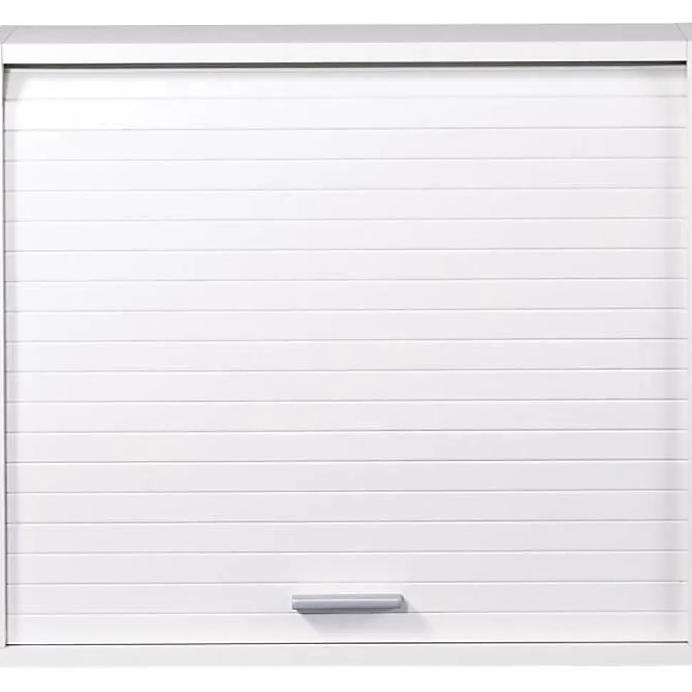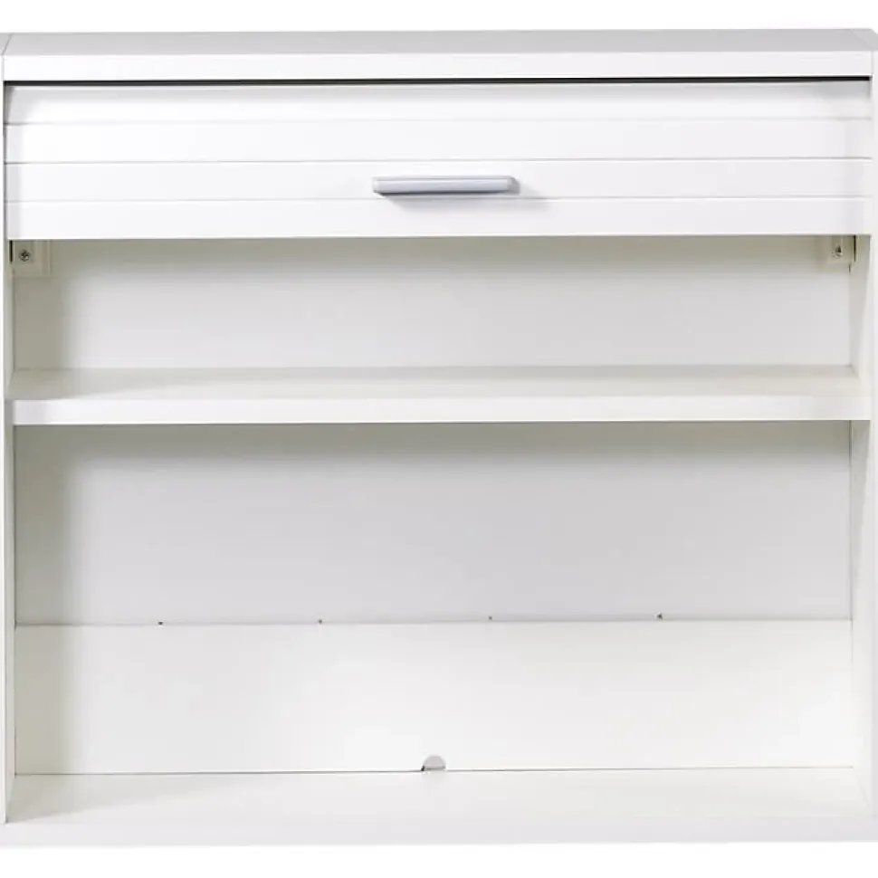 COOK Meuble de cuisine à poser ou à suspendre – En panneaux de particules – Coloris blanc – Muni de 3 tablettes réglables en hauteur et d’un rideau coulissant – Fabrication française – Dimensions standards avec la plupart des cuisines équipées : 60x25x54 cm.