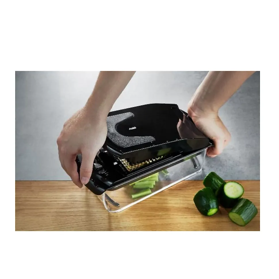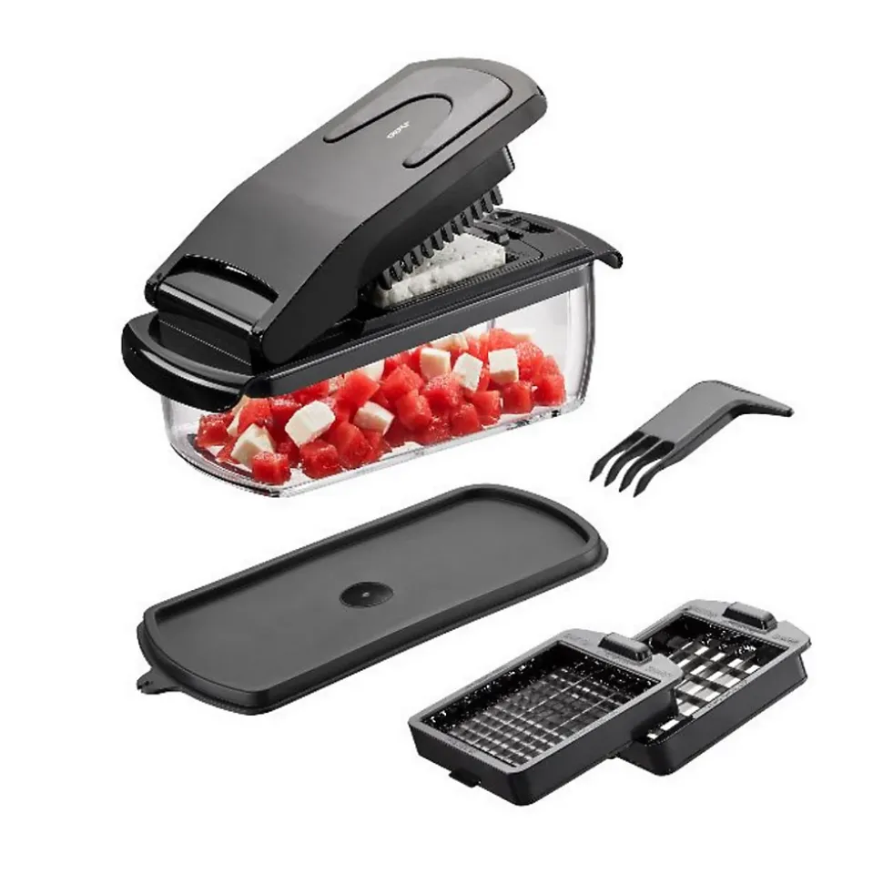 Le Coupe-dés et bâtonnets Treppo de Gefu est l’outil indispensable pour découper vos fruits et légumes en dés colorés et en bâtonnets, offrant une polyvalence d’utilisation incomparable. Grâce à ses lames ultra-tranchantes, vous obtiendrez des résultats uniformes sans le moindre effort. Que vous préfériez des coupes fines pour vos crudités ou des coupes plus grossières pour des frites croustillantes ou des potées délicieuses, le TREPPO vous accompagnera dans toutes vos préparations culinaires.Doté de 2 grilles de coupe interchangeables et blocables, vous pourrez réaliser des dés ou des bâtonnets fins (7 x 7 mm) ou grossiers (13 x 13 mm), selon vos préférences et vos besoins. De plus, sa conception démontable facilite grandement son nettoyage, vous permettant ainsi de gagner du temps en cuisine.Le Coupe-dés et bâtonnets TREPPO est également accompagné d’un couvercle de rangement et d’un peigne de nettoyage, vous assurant une utilisation pratique et hygiénique. Ses pieds antidérapants garantissent une stabilité optimale lors de son utilisation, pour une découpe en toute sécurité.Avec une capacité de remplissage de 1000 ml, le TREPPO vous permettra de préparer des quantités généreuses de vos fruits, légumes et fromages préférés en un seul geste, simplifiant ainsi votre expérience en cuisine.Collection : DECOUPE Matière : Acier inoxydable (inox) Couleur : Noir Longueur : 27.00 cm Largeur : 11.00 cm Hauteur : 12.00 cm Capacité : 100.00 cl Compatible Lave-vaisselle