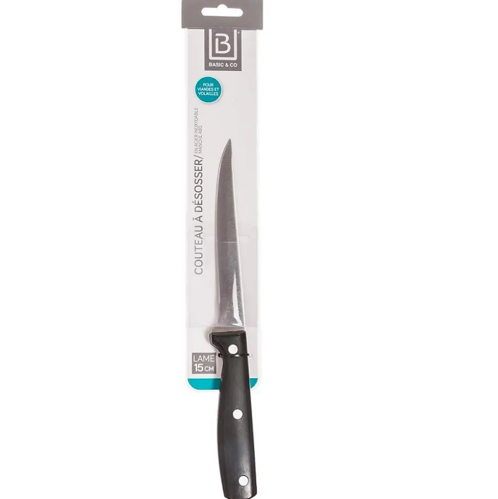 Dimensions : L. 2.70 x P.28.0 x H. 2.50 cmLongueur de la lame : 15 cmPoids : 0,11 kgMatière du manche : ABS – PlastiqueMatière de la lame : Acier inoxydableCompatibilité : Lave-vaisselleType de soie : Pleine soieType de couteau : Désosser