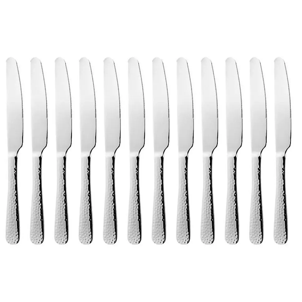 Couteaux pour restaurant en inox Ajoutez un charme subtil et rustique à vos tables avec ces couteaux en inox Olympia Tivoli. Fabriqués avec un manche martelé, ces couteaux ont un look pittoresque, donnant à votre table une ambiance conviviale pour que vos clients se sentent immédiatement à l’aise. Fabriqués en inox 18/10 de qualité supérieure, ces couteaux de table sont exceptionnellement tranchants et robustes, ce qui permet une coupe sans effort. La construction en inox de qualité professionnelle rend également ces couverts adaptés au lavage au lave-vaisselle professionnel, vous permettant de gagner un temps précieux lors du nettoyage. Ces couteaux conviennent parfaitement aux bars, cafés et restaurants traditionnels.Nombre de Pièces: 12Dimensions: 235(L) mmMatériel: Acier inoxydablePoids: 85 gFinition polieManches effet marteléManches en forme de larmeBords arrondis lissesLavables au lave-vaisselleLame dentéePetit couteau à dessert également disponible (code produit : DE382)