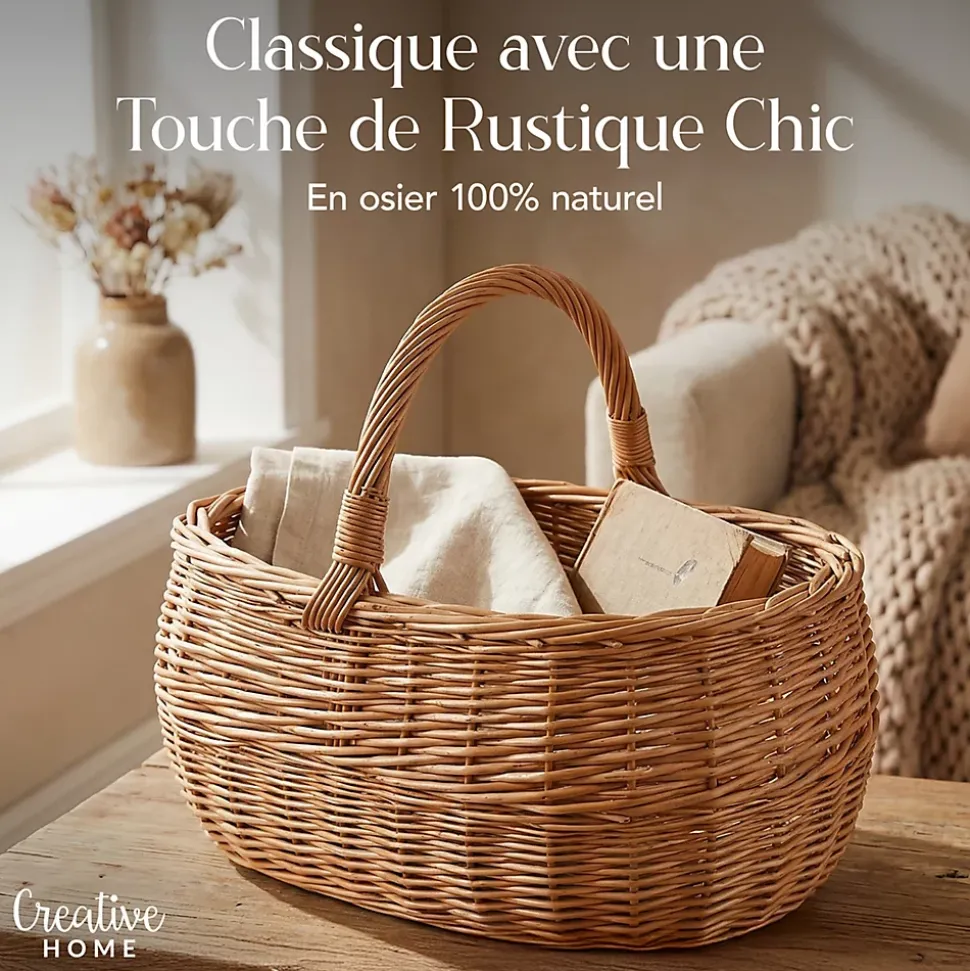 EXCELLENTE QUALITÉ – Le panier Creative Home est fabriqué à la main en osier 100 % naturel, pour une grande durabilité et une excellente résistance.Léger et équipé de poignées ergonomiques, il se transporte facilement au quotidien.Chaque panier est tissé à la main, ce qui le rend unique, avec une variation possible des dimensions de +/- 2 cm.MULTIFONCTIONNEL – Ce panier tressé convient aussi bien comme panier à provisions que comme élément de décoration.Idéal en panier cadeau ou corbeille à fruits, il est parfait pour les courses, les pique-niques, le transport en voiture, et le rangement de jouets, magazines ou plantes.ACCESSOIRE PRATIQUE POUR LA MAISON – Élégant et fonctionnel, son aspect naturel s’accorde avec tous les styles d’intérieur.Il peut aussi servir de corbeille à pain, panier à anses, panier à pommes de terre, panier de récolte, sac à provisions ou panier à champignons.DESIGN INTEMPOREL – Un accessoire décoratif et pratique, pensé pour garder la maison bien rangée, tout en ajoutant une touche naturelle.FABRIQUÉ DANS L’UE – Tous nos produits sont fabriqués dans l’Union européenne, où des normes de qualité strictes sont appliquées.Ils sont conçus à partir de matériaux naturels non toxiques, pour une qualité fiable et durable.