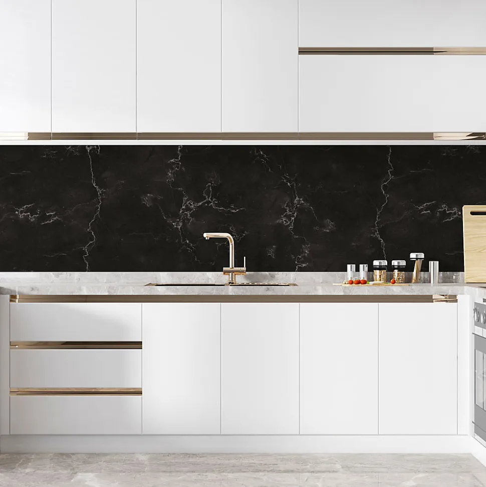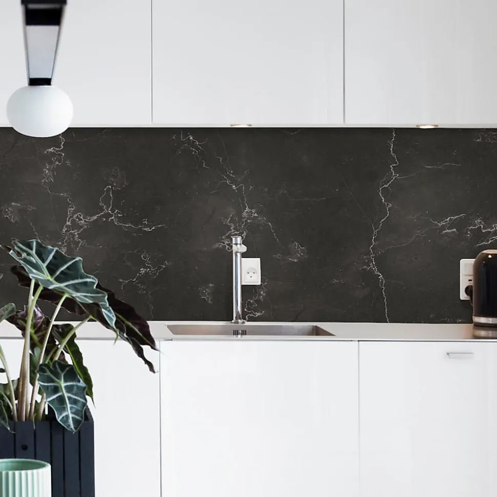 Envie d’une cuisine design ? Cette Crédence Adhésive Marbre Noir vous offre la liaison parfaite entre votre plan de travail et vos meubles hauts. Idéal aussi pour la salle de bains, cette crédence autocollante imperméable protège vos murs des éclaboussures. En effet, nos crédences adhésives protègent vos murs et sont faciles d’entretien.