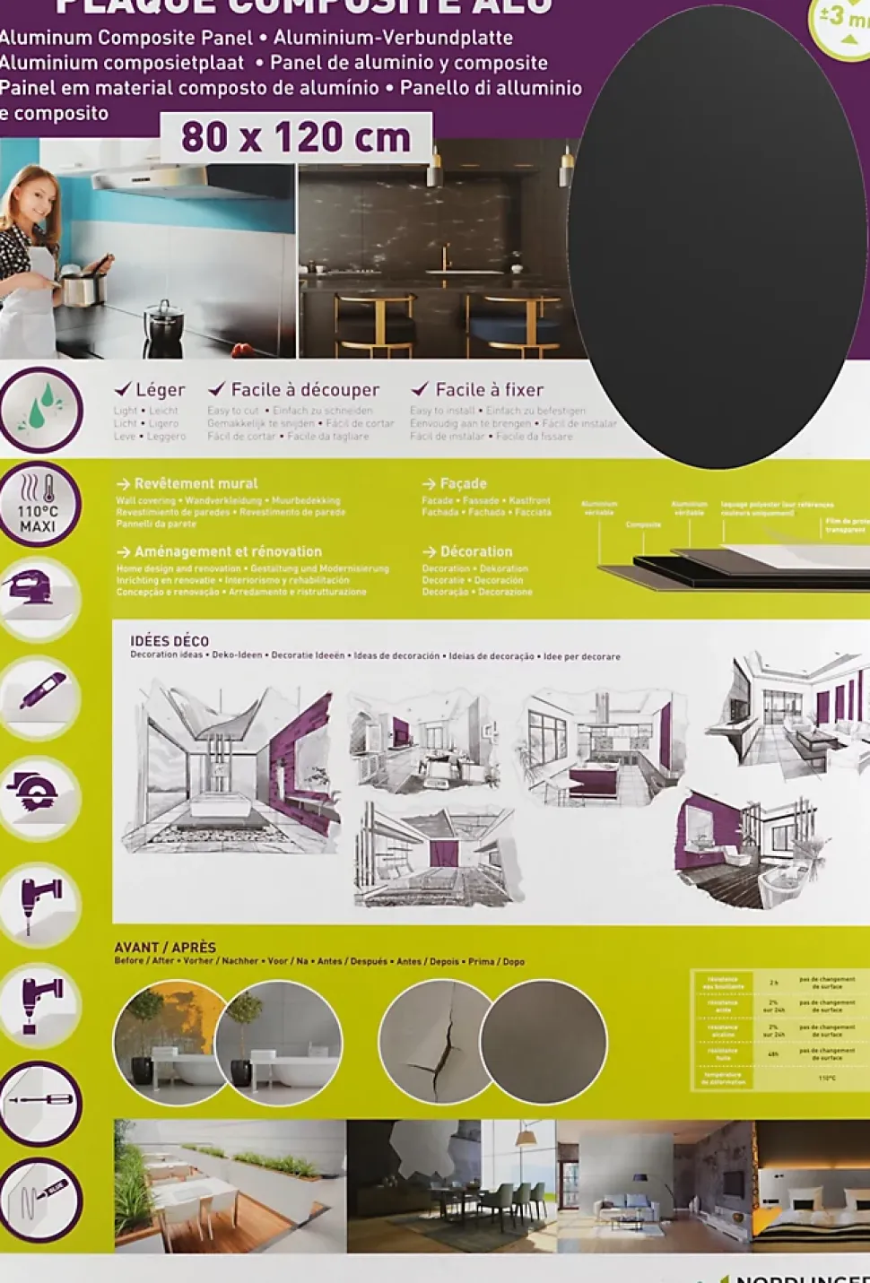 Idéales la rénovation et la décoration en revêtement mural, les plaques composites s’utilisent pour la création de nombreux aménagement intérieur : crédences de cuisine, crédences de salle de bains, contremarches, revêtements décoratifs et design en intérieur… Facilement positionnable en la vissant ou en la collant, cette crédence aluminium vous permet une excellente protection et bénéficient d’une longue durée de vie.