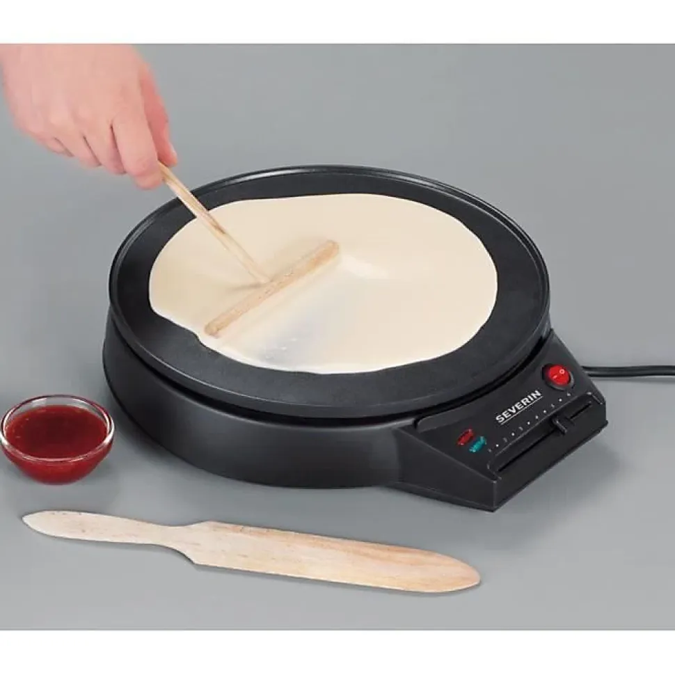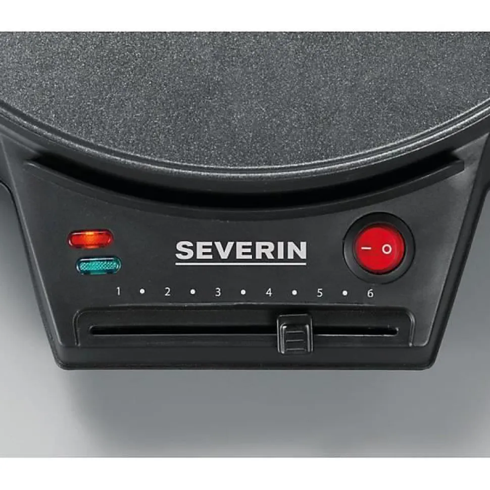 Crêpière 1000w 30cm Severin – – Puissance 1000 WSocle en matière plastique de qualité supérieurePlaque de cuisson anti-adhésive, Ø 30 cmThermostat réglableInterrupteur marche-arrêt avec voyant lumineux de contrôleTémoin prêt à l’emploiSpatule à crêpes et répartiteur de pâte en boisRangement de cordonVentouses anti-glisseDimensions : 30,5 x 35,5 x 8 cmPoids : 1,9 kg