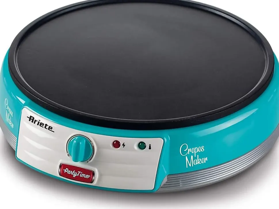 La crêpière électrique Ariete Party Time offre une expérience de cuisson conviviale grâce à sa puissance de 1000 W et sa plaque antiadhésive qui garantit des crêpes parfaitement cuites sans collage. Elle est livrée avec deux spatules en bois et un distributeur de pâte pour faciliter la préparation, ainsi qu’un livret de recettes pour varier les plaisirs. Le voyant lumineux indique lorsque l’appareil est sous tension et prêt à l’usage. Compacte et légère, cette crêpière au design festif bleu ciel est idéale pour les desserts et en-cas pour toute la famille ou entre amis.