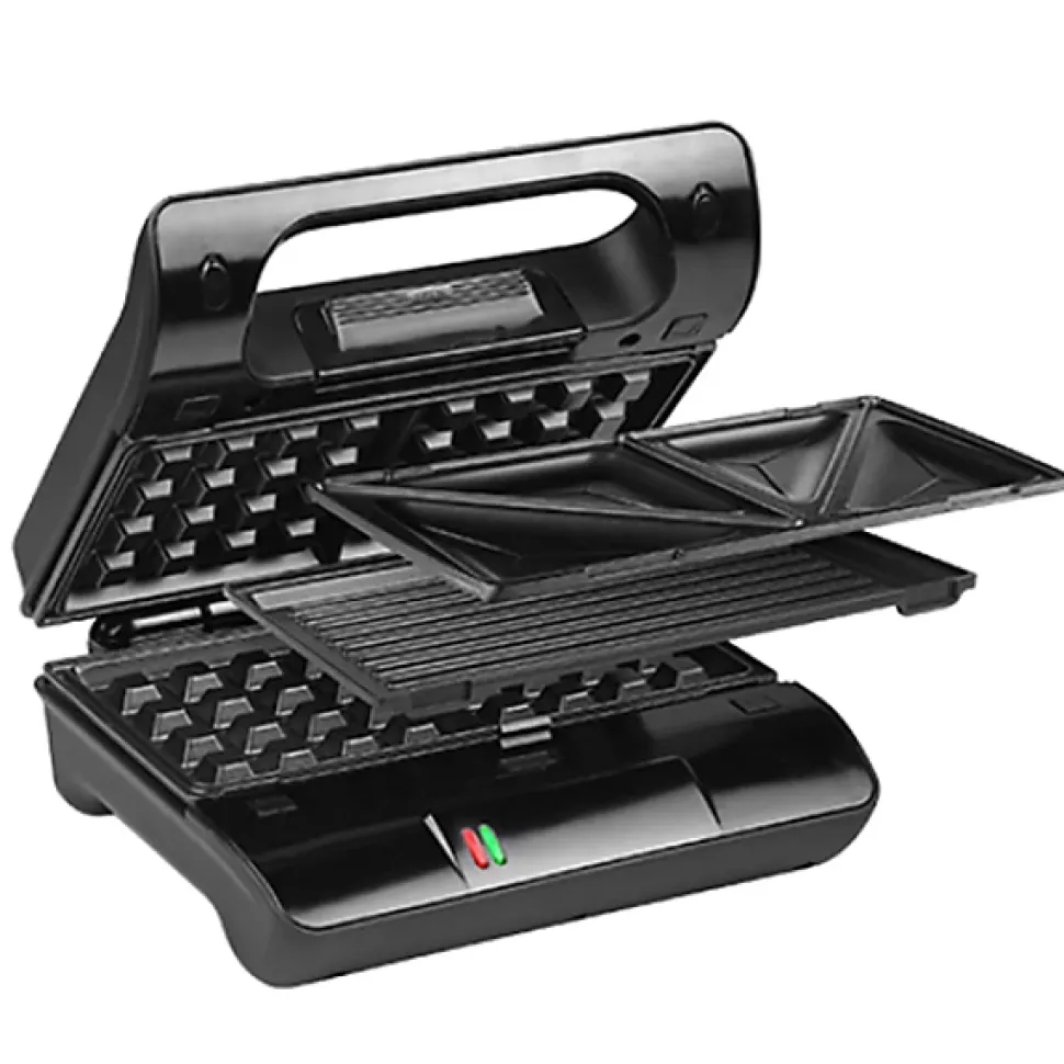 Croque-gaufre-gril 3 plaques 800w Princess – – Puissance du croque-gaufre-gril : 800 w.3 jeux de plaques interchangeables.- Gril- Croque Monsieur- Gaufrier.Plaques avec revêtement anti-adhèrent.Témoins lumineux de fonctionnement « marche » et « fin de cuisson ».Dispositif anti surchauffe.Poids : 2.28 kg.