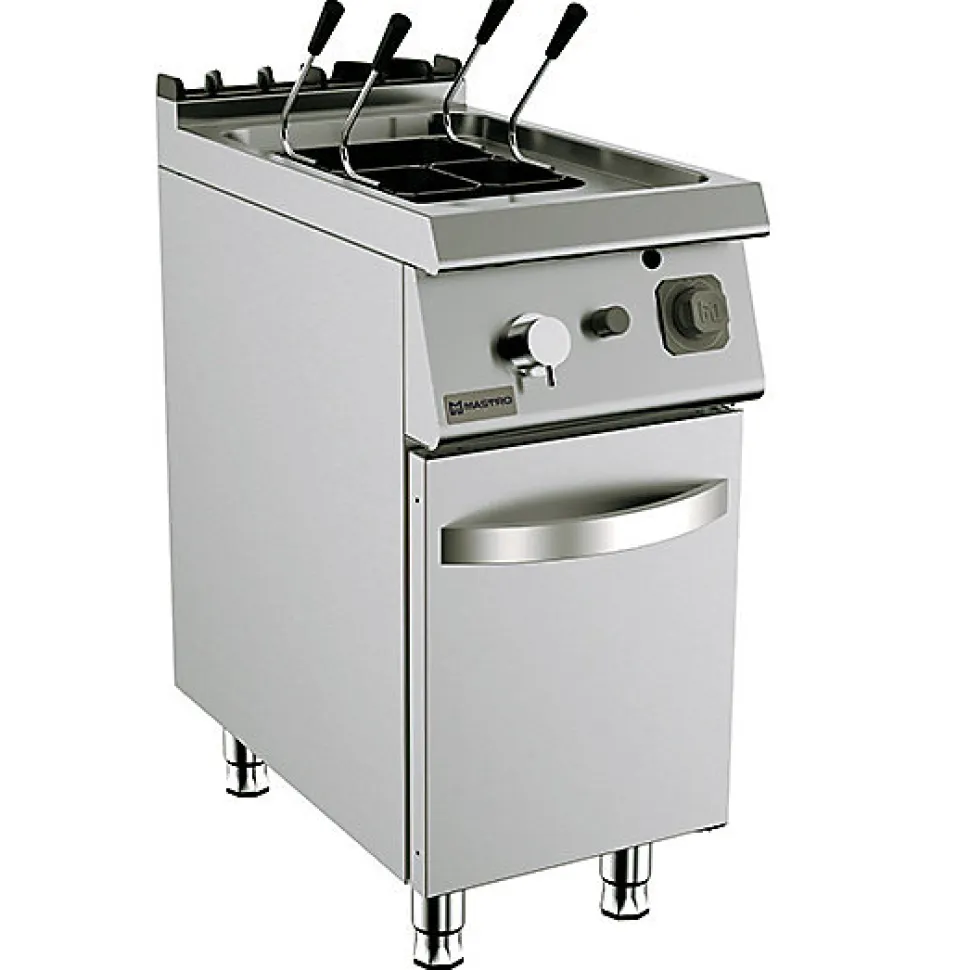 Cuiseur à pâtes gaz sur soubassement fermé, 18 litres Contrôle de la température par thermostat. Témoin lumineux lorsque la température requise est atteinte. Bac conçu pour éviter les débordements. Température de fonctionnement (0-100°C). Paniers en acier inoxydable AISI 304. Résistances en alliage spéciale.