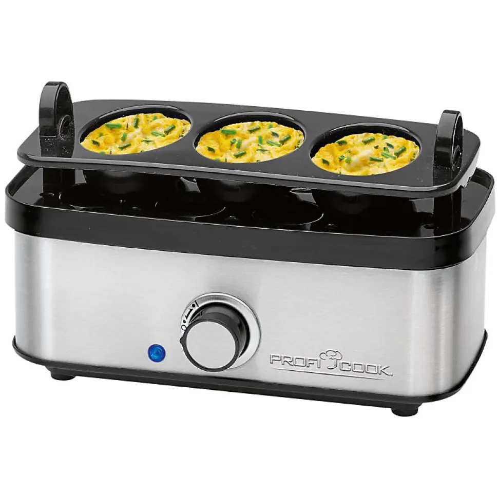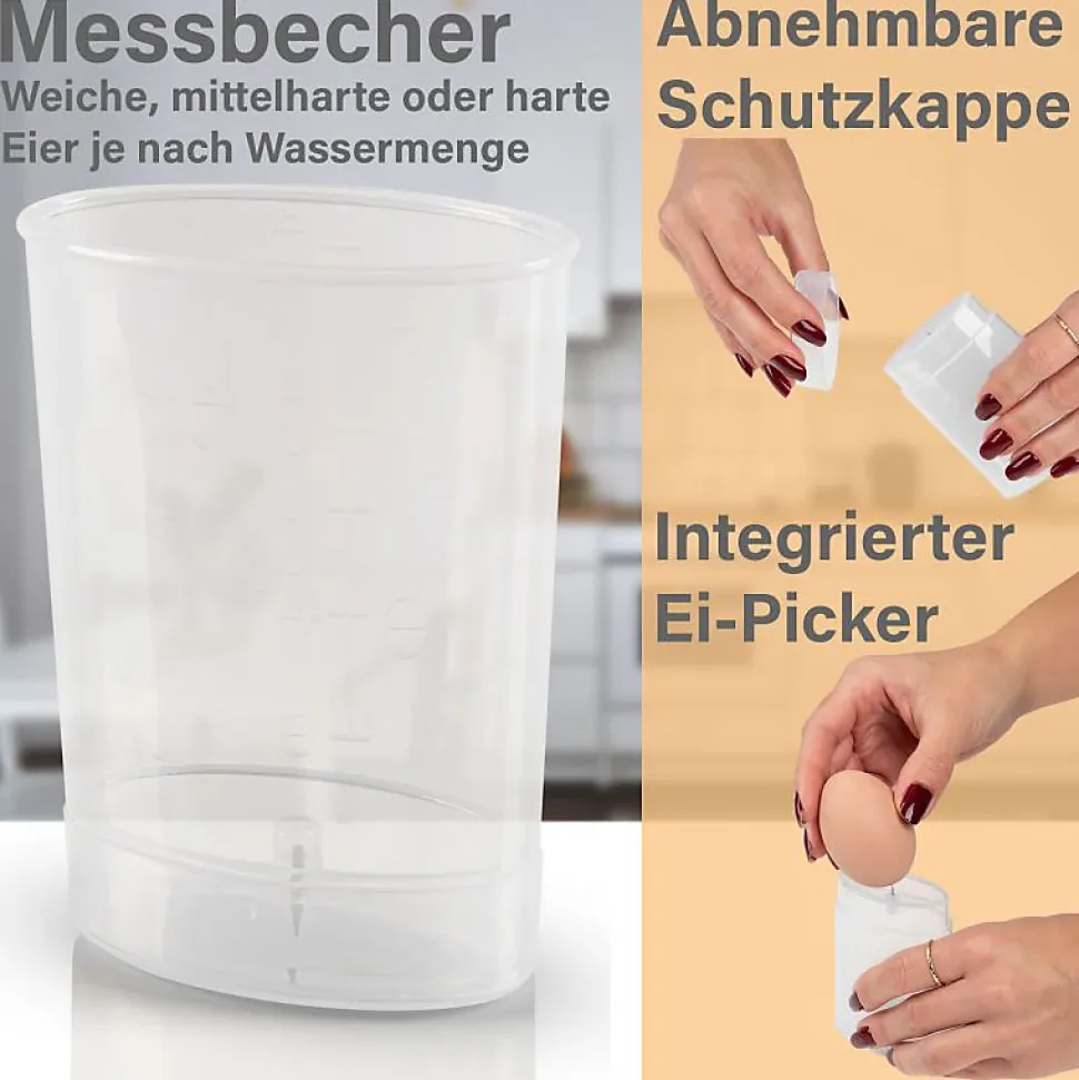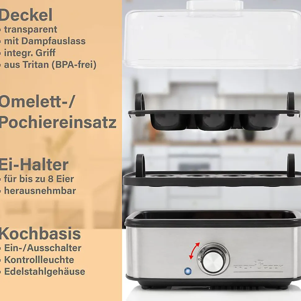 Préparation de jusqu’à 8 œufsFonction omelette/pochage (plateau amovible)Boîtier en acier inoxydableInterrupteur marche/arrêtTémoin lumineuxSignal sonore (buzzer)Porte-œufs (amovible)Couvercle transparent en tritan (sans BPA)Gobelet de mesure avec pique-œuf et bouchonPlaque chauffante à revêtement antiadhésif230 V, 50-60 Hz, 400 W