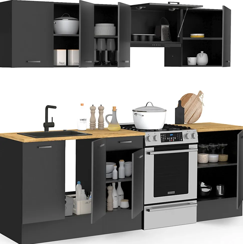 À la recherche d’une cuisine noire et bois complète de 240 cm pour meubler votre intérieur ? Optez sans attendre pour la cuisine SUBTIL de 240 cm ! Élément principal de votre intérieur, le choix de votre cuisine est primordial. Imaginez-vous en train de cuisiner dans votre future cuisine aménagée, un bon plat, pour vos amis ou votre famille, sur le plan de travail de votre superbe cuisine SUBTIL. Grâce à ce plan de travail de 2.5 cm d’épaisseur et 90 cm de hauteur, vous n’aurez pas à vous pencher lorsque vous détaillerez vos poivrons. Stockez vos cocottes et casseroles dans les meubles de 60 cm et 40 cm avec tiroir. Le meuble de 80 cm sans étagère est conçu pour recevoir votre évier ainsi que la tuyauterie. De plus, vous pouvez découper le plan de travail selon vos dimensions d’évier. Pour une harmonie dans votre intérieur, chaque meuble bas de cuisine a un meuble haut de cuisine de sa longueur. Vous pouvez organiser votre stockage dans les meubles de 80, 60 et 40 cm selon votre besoin. Le meuble hotte est quant à lui muni d’une porte à battant relevable. Chacun d’une profondeur de 32 cm, les meubles hauts de cuisine vous permettent de stocker vos verres comme vos condiments.Avec ses sept éléments, la cuisine complète avec plan de travail vous offre une solution clé en main ! N’hésitez plus et craquez pour son design moderne et tendance !Le plan de travail de 60 cm de profondeur dépasse légèrement des meubles bas pour un rendu plus esthétique et une meilleure aisance de nettoyage. Conseil IDMarket : pensez à bien séparer votre four et vos plaques d’au moins 40 cm d’un point d’eau (lave-vaisselle – évier). Ne posez pas de plats chauds directement sur votre plan de travailNos cuisines SUBTIL 180 et 240 cm sont livrées sans électroménager.Dimensions de la cuisine SUBTIL 240 cm Dimensions globales du produit : Longueur 240 cm x largeur 60 cm x hauteur 210 cmHauteur du plan de travail : 90 cmÉpaisseur du plan de travail : 2.5 cmEtagères réglables 3 positionsÉlément du ba