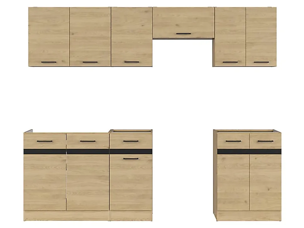 Ensemble de meuble de cuisine d’une longueur de 240 cm comprend à la fois des armoires basses de cuisine et des armoires suspendues de cuisine afin d’offrir une solution de rangement complète. Cet ensemble contient tous les éléments nécessaires pour une cuisine fonctionnelle et bien organisée.Dimension des meubles bas : Profondeur 47 x Hauteur 82,5 cmDimension des meubles hauts : Profondeur 30,5 x Hauteur 57,5 cmCouleur : Chêne bersteinStructure et façade : panneaux de particules , MDFPoids : 103 kgAccessoires : charnières Hettich, poignée en plastique, glissièresPlan de travail , évier robinetterie , Appareils électroménagers non inclus
