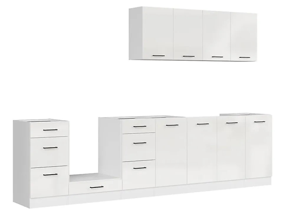 Ensemble de meuble de cuisine d’une longueur de 300 cm comprend à la fois des armoires basses de cuisine et des armoires suspendues de cuisine afin d’offrir une solution de rangement complète. Cet ensemble contient tous les éléments nécessaires pour une cuisine fonctionnelle et bien organisée.Dimension des meubles bas : Profondeur 47 x Hauteur 82,5 cmDimension des meubles hauts : Profondeur 30,5 x Hauteur 57,5 cmCouleur : Blanc/Craie brillantStructure et façade : panneaux de particules , MDFPoids : 138 kgAccessoires : charnières Hettich, poignée en plastique, glissièresPlan de travail, évier robinetterie , Appareils électroménagers non inclus