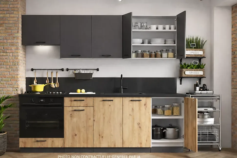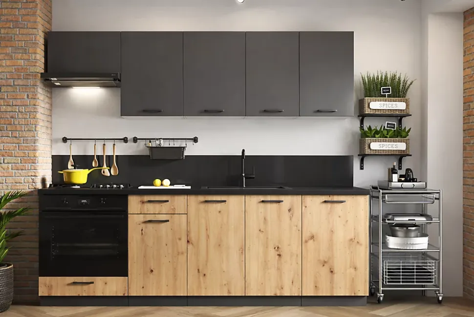 Cuisine moderne au style industriel, alliant la couleur du bois naturel et une finition foncée mate pour un rendu chaleureux et contemporain.Les meubles bas sont dotés de façades en couleur bois clair avec veinage apparent, offrant un aspect authentique et robuste. Ils sont équipés de poignées noires minimalistes, assurant une ouverture pratique et un design épuré.Les meubles hauts, de coloris gris anthracite mat, apportent une touche moderne et contrastée. Leur ligne droite et leur finition lisse offrent un espace de rangement généreux tout en conservant une esthétique sobre.Les matériaux robustes et la conception fonctionnelle font de cette cuisine un espace à la fois pratique, durable et esthétique, parfaitement adapté à un intérieur moderne ou loft.Cuisine composée de 6 meubles. Dim 1m80. Haut gris foncé mat et bas chêne clair mat. Façades en panneaux de particules et poignées plastiques noires. Fourni sans plan de travail ni évier ni mitigeur ni électroménager. 3 meubles hauts et 3 meubles bas. Fabrication et normes CE.