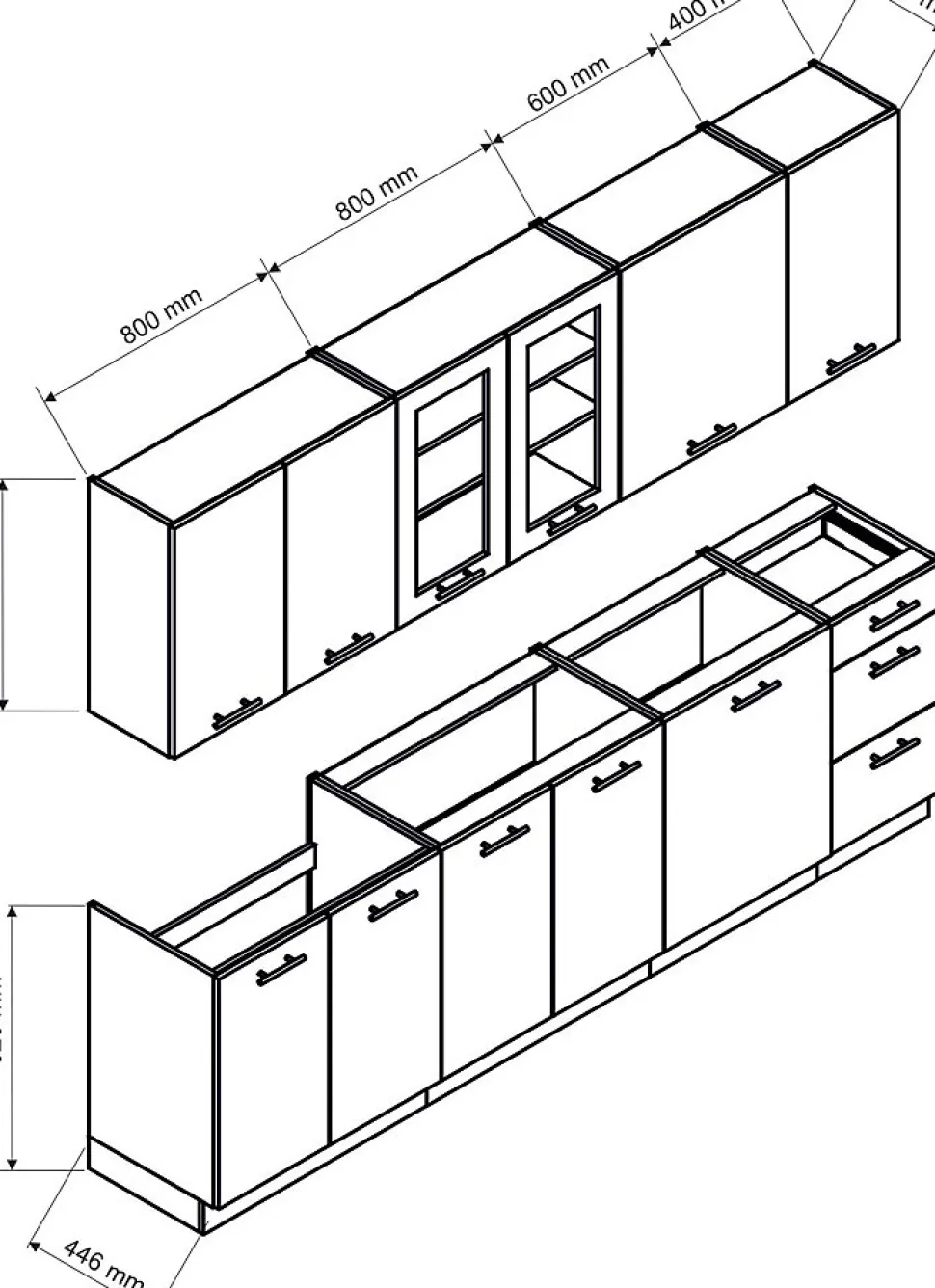 Cuisine complète composée de 8 meubles avec façades couleur gris mat, structures et plinthes couleur gris clair. Plan de travail non inclus. Composition : * 1 meuble sous évier 2 portes L 80 x P 44,6 x H 82 cm (livré sans évier)* 1 meuble bas 2 portes avec 1 étagère réglable en hauteur L80 x P 44,6 x H 82 cm * 1 meuble bas 1 porte réversible avec 1 étagère réglable en hauteur L60 x P 44,6 x H 82 cm * 1 meuble bas 3 tiroirs L 40 x P 44,6 x H 82 cm * 1 meuble haut 1 porte réversible avec 2 étagères réglables en hauteur L 60 x P 28,8 x H 72 cm* 1 meuble haut 2 portes vitrées avec 2 étagères réglables en hauteur L 80 x P 28,8 x H 72 cm* 1 meuble haut 2 portes avec 2 étagères réglables en hauteur L 80 x P 28,8 x H 72 cm* 1 meuble haut 1 porte réversible avec 2 étagère réglables en hauteur L 40 x P 28,8 x H 72 cmNon inclus : Plan de travail, électroménager, évier, robinetterie, éclairage, aménagement de tiroir, visserie pour fixation murale Livré en Kit devant votre porte d’immeuble ou de maison. Pour cette prestation de livraison, le transporteur n’est pas habilité à effectuer une remise de colis dans la pièce d’utilisation. Ainsi, l’installation ne pourra donc pas être effectuée et les emballages ne seront pas repris par le livreur. Fabrication : Union européenne Dimensions totales : Longueur 260 cm Matériaux : panneau de particules épaisseur 16 mm, poignées en métal. Poids brut : 166,9 kg