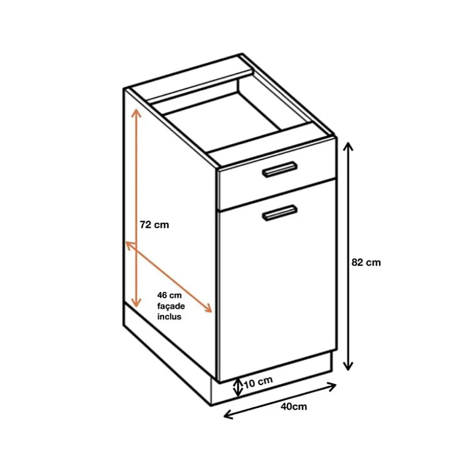 - LE MEUBLE BAS DE CUISINE ECO avec tiroir à frein de fermeture Cuisineandcie est design, fonctionnel et économique. Composé d’une porte équipée de charnières renforcées ajustables et d’amortisseurs pour une fermeture discrète et automatisée, il présente les dimensions suivantes : L 40 x H 82 x P 46cm.