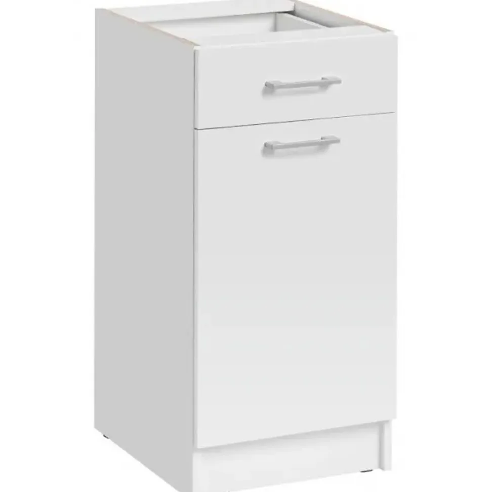 Meuble bas de cuisine avec 1 porte et 1 tiroir DS4/1Modèle ECO BlancL 40 x H 82 x P 46 cmLe Modèle DS4/1 du catalogue ECO Blanc est un meuble de rangement peu encombrant, élégant et fonctionnel. Il vous permettra d’optimiser votre espace et d’assurer un tiroir pratique pour vos ustensiles.Il comporte une porte à charnières réglables renforcées avec amortisseurs pour une fermeture douce et silencieuse. Sa façade de qualité en stratifié 18 mm présente une légère texture, reproduisant subtilement les veines du bois.Le modèle Eco – Blanc est fait pour vous si vous êtes à la recherche d’une cuisine fonctionnelle, durable et épurée sans vous ruiner !