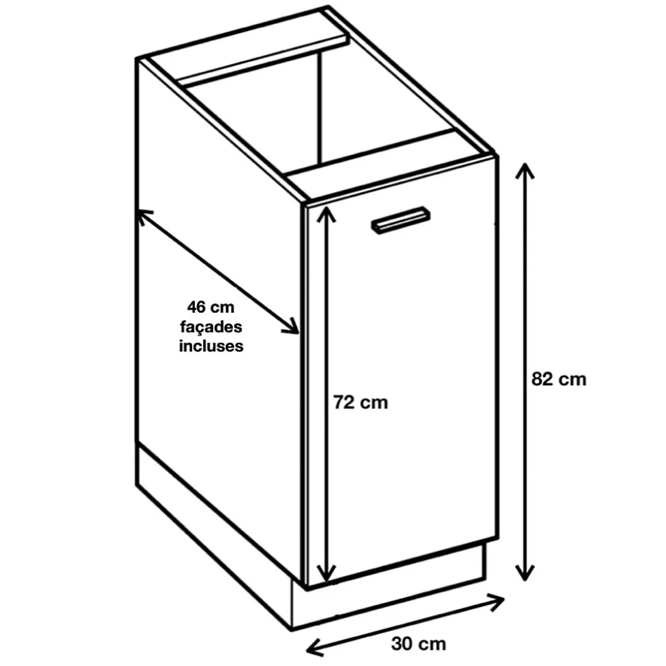 - LE MEUBLE BAS DE CUISINE ECO Cuisineandcie est design, fonctionnel et économique. Composé d’une porte équipée de charnières renforcées ajustables et d’amortisseurs pour une fermeture discrète et automatisée, il présente les dimensions suivantes : L 30cm x H 82cm x P 46 cm.