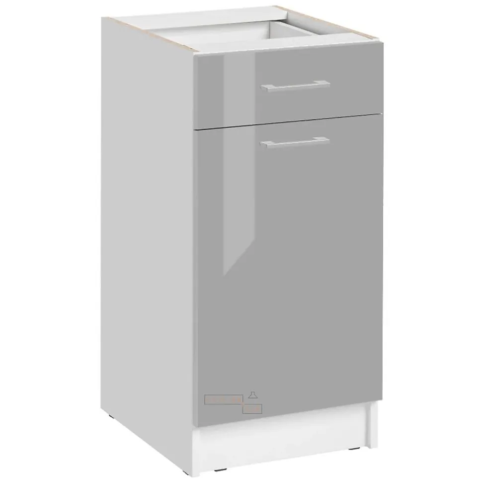 Meuble bas de cuisine avec 1 porte et 1 tiroir DS4/1Cuisine ECO Gris laquéL 40 x H 82 x P 46 cmLe Modèle DS4/1 Eco Gris brillant est un meuble de rangement peu encombrant qui vous permettra d’optimiser l’espace dont vous disposez. Il comprend une porte à charnières réglables renforcées avec amortisseurs pour une fermeture douce et silencieuse. La qualité particulière de sa façade lui donne la brillance du verre.Il est livré avec une plinthe individuelle amovible de série.
