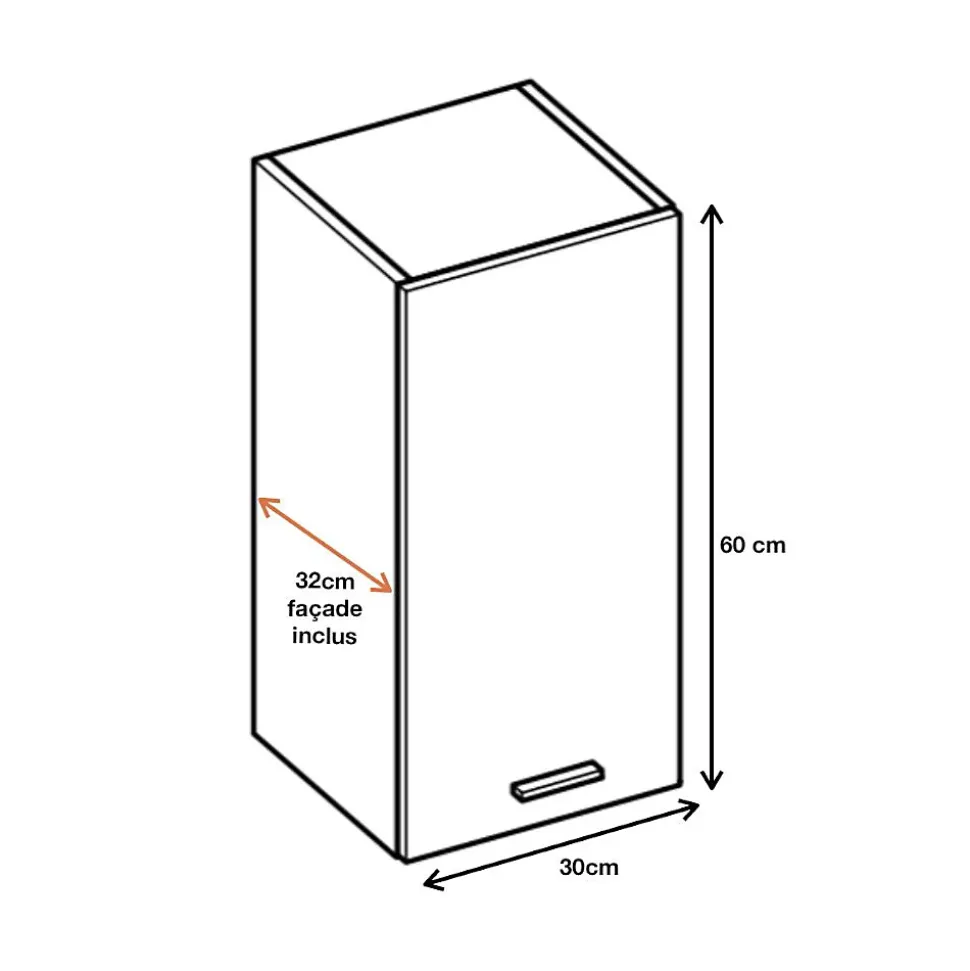 - LE MEUBLE CUISINE HAUT ECO Cuisineandcie est design, fonctionnel et économique. Composé d’une porte équipée de charnières renforcées ajustables et d’amortisseurs pour une fermeture discrète et automatisée, il présente les dimensions suivantes : L 30cm x H 60cm x P 32 cm.