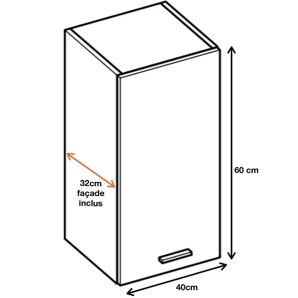 - LE MEUBLE CUISINE HAUT ECO Cuisineandcie est design, fonctionnel et économique. Composé d’une porte équipée de charnières renforcées ajustables et d’amortisseurs pour une fermeture discrète et automatisée, il présente les dimensions suivantes : L 40cm x H 60cm x P 32 cm.