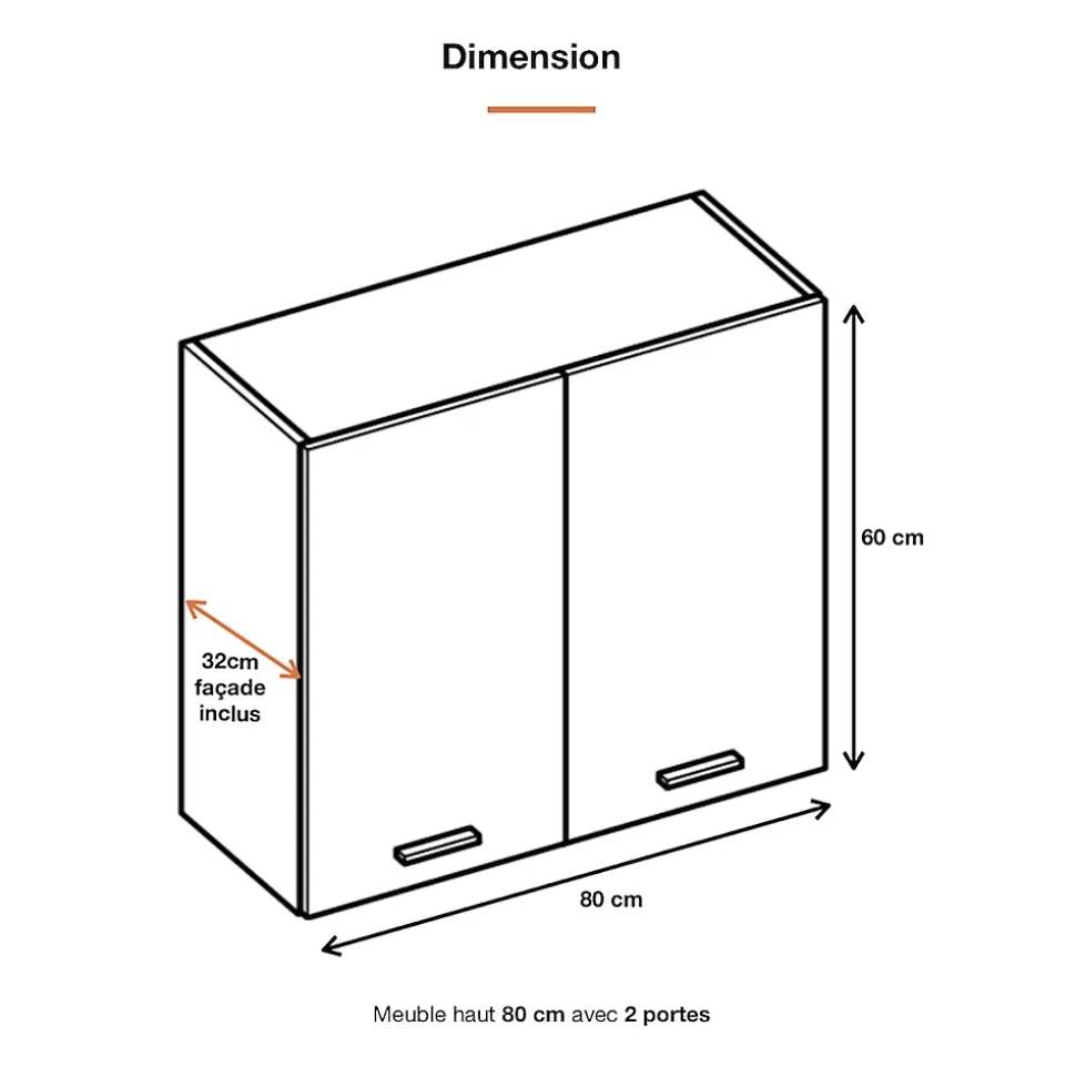 - LE MEUBLE CUISINE HAUT double portes Cuisineandcie est design, fonctionnel et économique. Composé de 2 portes équipées de charnières renforcées ajustables et d’amortisseurs pour une fermeture discrète et automatisée, il présente les dimensions suivantes : L 80cm x H 60cm x P 32 cm.