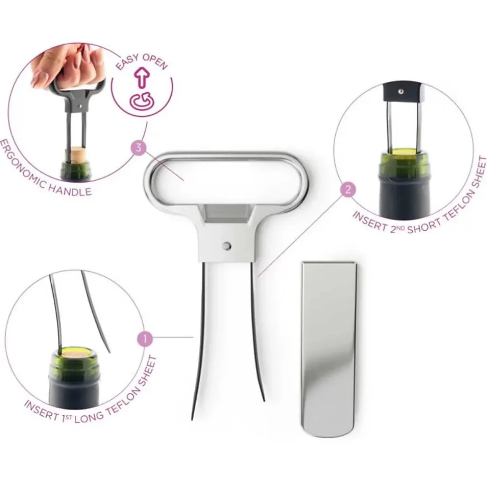 - Extracteur de bouchon à deux pointes avec revêtement en téflon, idéal pour les vins anciens ou les bouchons endommagés. Il permet une extraction sans perforation, évitant ainsi les résidus dans le vin.