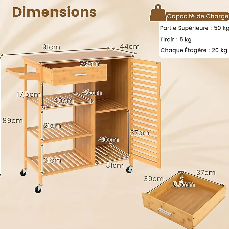 INFOS SPÉCIFIQUES :Couleur : NaturelMatériau : Bambou, MDFDimensions du produit : 88,5 x 40 x 103,5 cm (L x l x H)Capacité de charge : 100 kgPoids net : 16,2 kgCE QUI VOUS RECEVREZ :1 x Chariot de cuisine roulettes1 x Manuel d’utilisateur
