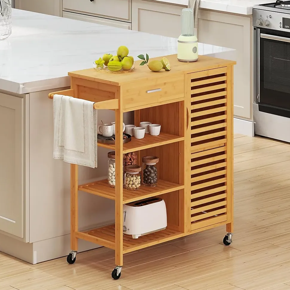 - Chariot de Cuisine Multifonction : Ce chariot de cuisine à deux portes, de couleur bambou naturel, combine parfaitement praticité et esthétique. L’abondant espace de rangement répond aux multiples besoins de préparation des repas, de conservation et d’exposition. Il peut être utilisé comme table de préparation des repas, table à manger temporaire ou meuble de rangement.