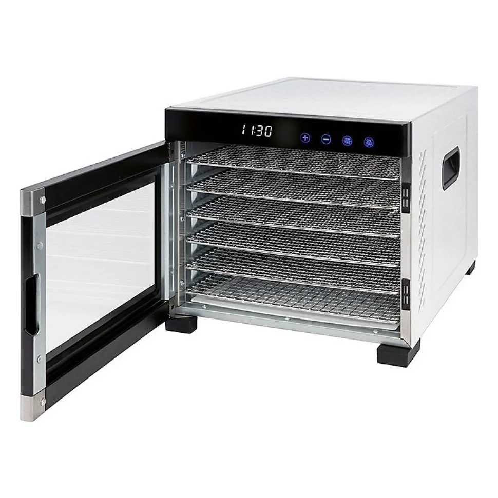 – Déshydrateur d’aliments en acier inoxydable pour sécher les fruits, les légumes, les herbes, la viande, les champignons, le poisson et plus encore. Riche en minéraux essentiels pour le bien-être, la remise en forme et la santé- Le séchage est une méthode très douce – tous les ingrédients sont préservés- Préparation de p. Ex. barres de muesli, b?uf séché, bouillon de légumes séchés, granola ou chips de légumes possible- HAUTE PERFORMANCE: Sèche les fruits, les légumes, la viande et d’autres aliments en un temps record pour produire des collations et des ingrédients délicieux et durables.- BONNE TEMPÉRATURE: Que ce soit pour préparer des fruits secs riches en vitamines tels que des chips de pomme et de banane ou des légumes sains tels que des tomates séchées- la bonne température peut être réglée pour tous les goûts.- CIRCULATION DU FLUX D’AIR: Une répartition uniforme de la chaleur grâce à une circulation d’air à 360 ° et un thermostat numérique garantissent qu’il ne reste pas d’eau dans les aliments et que le temps de séchage est court.- NETTOYAGE FACILE: Le nettoyage après le processus de déshydratation est simple: les 6 grilles de table en acier inoxydable, le revêtement antiadhésif et le plateau peuvent être rincés facilement.- Convient également pour la préparation d’aliments / friandises pour animaux de compagnie de haute qualité, comme la viande séchée- Grand intérieur avec jusqu’à 6 niveaux utilisables (0,6 m²) *- Livré avec 6 grilles en acier inoxydable (33 x 30,5 cm par grille) pour divers aliments séchés (durable, sans danger pour les aliments, hygiénique, facile à nettoyer, au lave-vaisselle)- Boîtier en acier inoxydable calorifugé (double paroi)- Porte en verre avec grande fenêtre de visualisation- Réglage de la température: 35-75 ° C par incréments de 5 ° C- Thermostat numérique inclus- Affichage électronique de la température (° C)- Minuterie électroniq