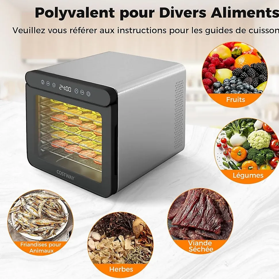 - Matériau Sûr: Ce séchoir à aliments est entièrement fabriqué en acier inoxydable de haute qualité pour une résistance et une durabilité à haute température, les plateaux en acier inoxydable de qualité alimentaire sont sans BPA et sûrs avec des bords lisses et arrondis, et surtout, les plateaux sont lavables au lave-vaisselle pour un nettoyage facile.