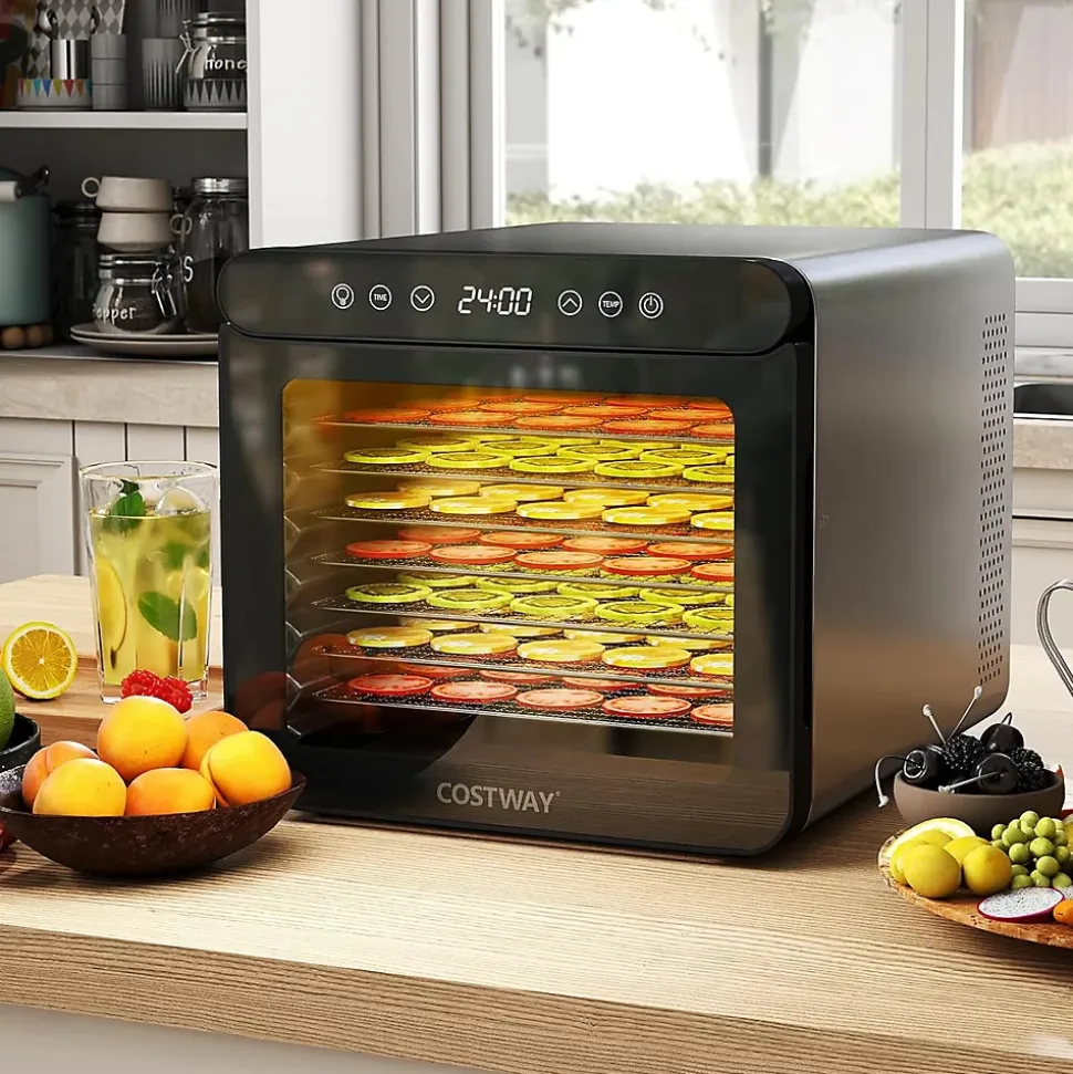 Avec le déshydrateur pratique, vous obtenez une grande quantité de fruits secs d’un coup. Après avoir inséré 7 plateaux en acier inoxydable de qualité alimentaire, vous pouvez sécher de grandes quantités d’aliments à la fois, et pour les aliments fins, vous pouvez également utiliser des plateaux en PP. Une fois que vous avez réglé le temps (1 à 24 heures) et la température (30°C-75°C) via l’écran tactile, la technologie de circulation d’air chaud et le ventilateur arrière assurent une distribution uniforme de la chaleur, permettant aux aliments de sécher rapidement et uniformément.