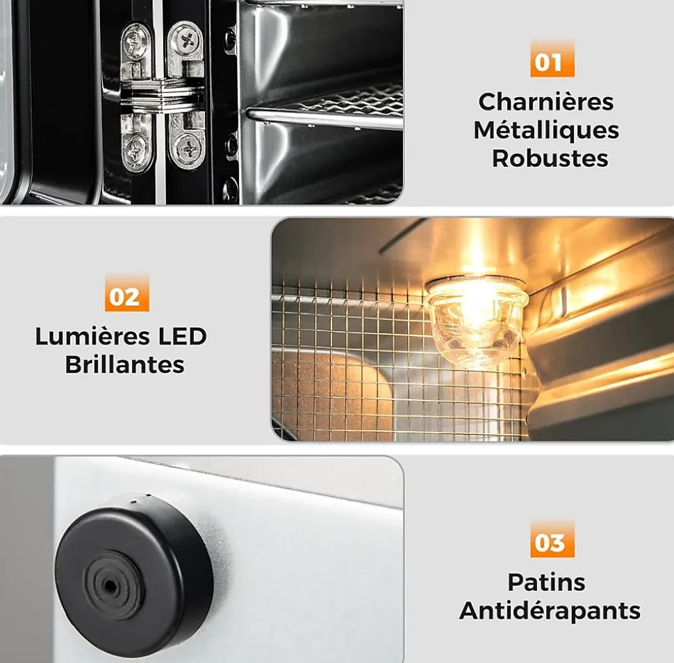 La fenêtre transparente vous permet de garder un œil sur le séchage des aliments à l’intérieur, tandis que la lumière intégrée offre un éclairage et rend le processus de séchage plus visible. De plus, la taille compacte du séchoir est parfaite pour votre espace limité dans la cuisine.