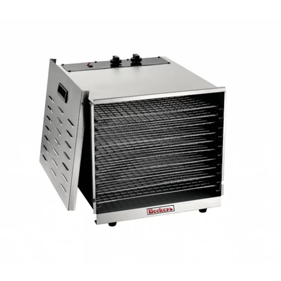 Déshydrateur alimentaire professionnel Beckers en acier inox – Mod. ED 1 – 10 plateaux amovibles. Idéal pour le séchage des fruits, légumes, viandes, poissons, pâtes, champignons et herbes aromatiques. #html-body [data-pb-style=EBI5BH7]{justify-content:flex-start;display:flex;flex-direction:column;background-position:left top;background-size:cover;background-repeat:no-repeat;background-attachment:scroll}Déshydrateur / Sécheur Professionnel Beckers – Mod. ED 1Le déshydrateur Beckers est un équipement haut de gamme conçu pour les cuisines professionnelles. Fabriqué en acier inoxydable de haute qualité, il garantit une robustesse exceptionnelle, une hygiène optimale et une longévité adaptée aux usages intensifs. Polyvalent, il assure le séchage homogène et maîtrisé d’une large variété d’aliments : fruits, légumes, herbes aromatiques, champignons, viandes, pâtes fraîches et bien d’autres préparations.Grâce à sa technologie de déshydratation avancée, ce déshydrateur professionnel permet d’éliminer efficacement l’eau des aliments tout en préservant vitamines, minéraux et nutriments essentiels, assura