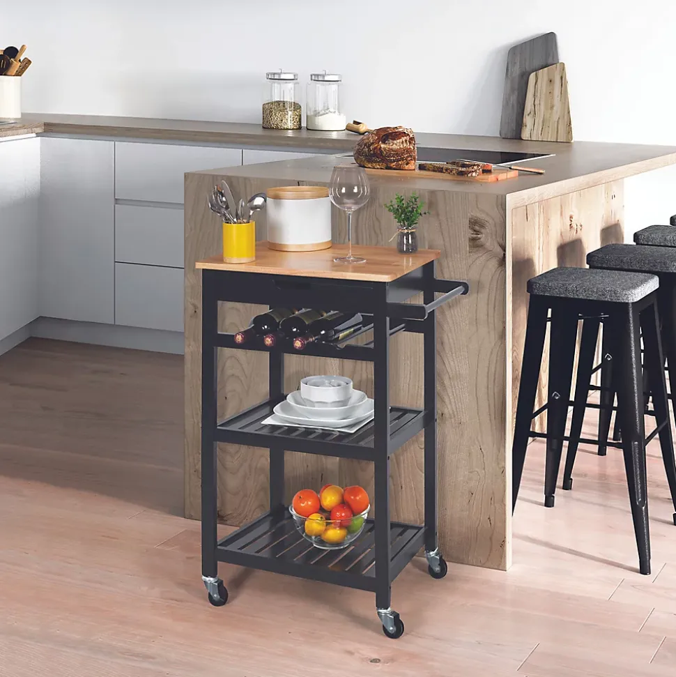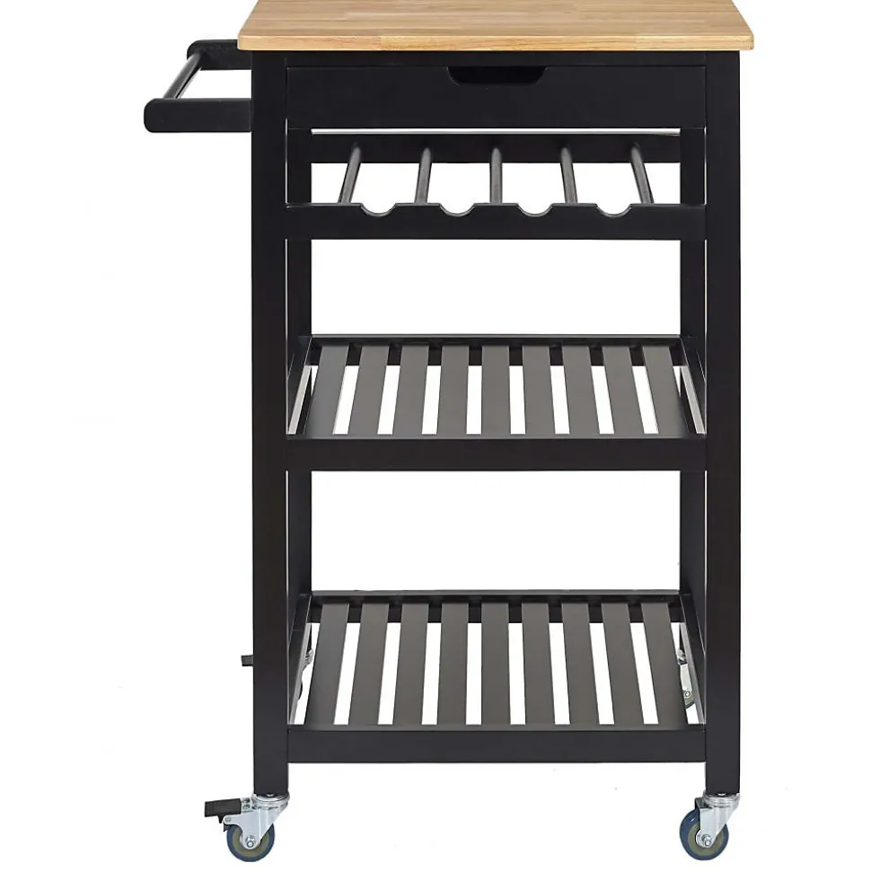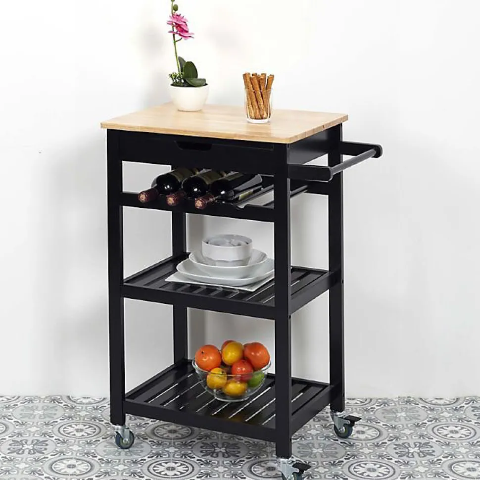 Aspect : Matériau principal = MDF • Matériaux secondaires = Pin • Dimensions : Hauteur (en cm) = 84,50 • Longueur (en cm) = 40 • Profondeur (en cm) = 61 • Autres caractéristiques : Informations complémentaires = Avec tiroir , 4 roulettes , 2 étagère , 1 range bouteille • Livré en kit = Oui • Poids (en kg) = 8,80 • Desserte à roulettes en bois 40 x 61 x 84.5 cm