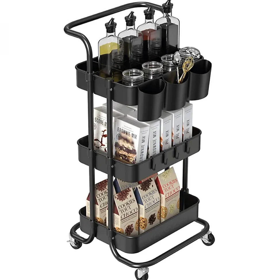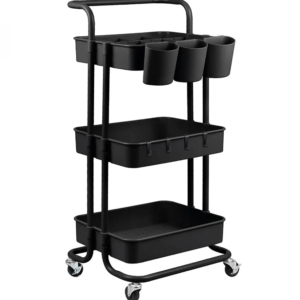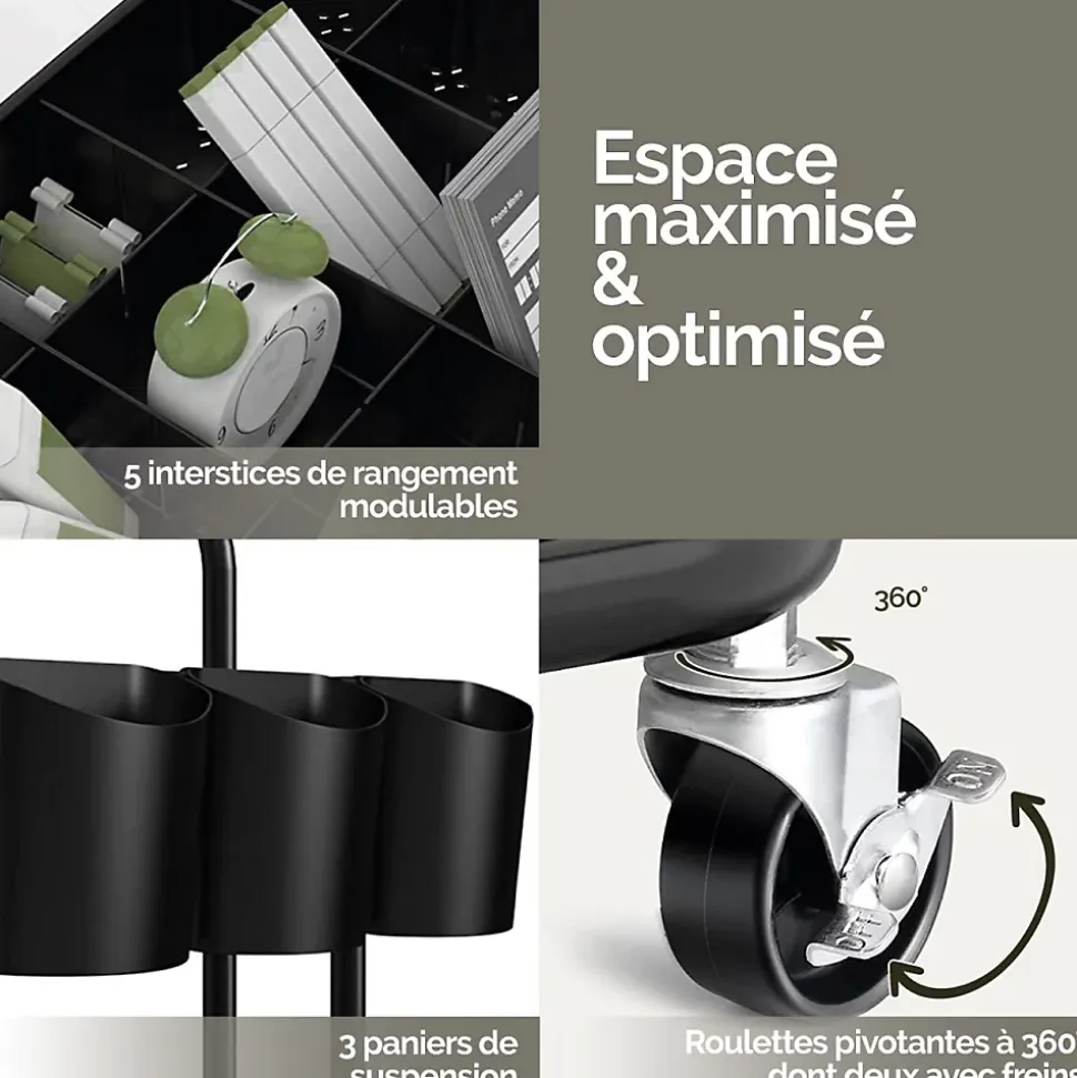 Le chariot de rangement avec poignée Vivezen va devenir votre allié du quotidien, il dispose en effet de 3 étagères permettant d’optimiser au maximum l’espace dans les moindres recoins. Disposant également de 3 paniers et 5 interstices de rangement, ce chariot est votre allié du quotidien.Fabriqué en ABS et en acier au carbone, ce chariot de rangement large 3 étagères est solide et résistant. Chaque étagère peut supporter jusqu’à 7 kilos, de quoi stocker largement.Ce chariot de rangement possède des roues pivotantes à 360° dont deux avec freins. Pesant moins de 4 kilos, ce chariot est facile à stocker et à transporter, il se glisse et se pousse facilement à l’aide de sa poignée.En seulement quelques minutes votre chariot de rangement avec poignée est monté et prêt à être utilisé, aucun outil est nécessaire. Le chariot mesure 86 cm de hauteur, 33 cm de profondeur et 42 cm de largeur.Disponible en plusieurs coloris.