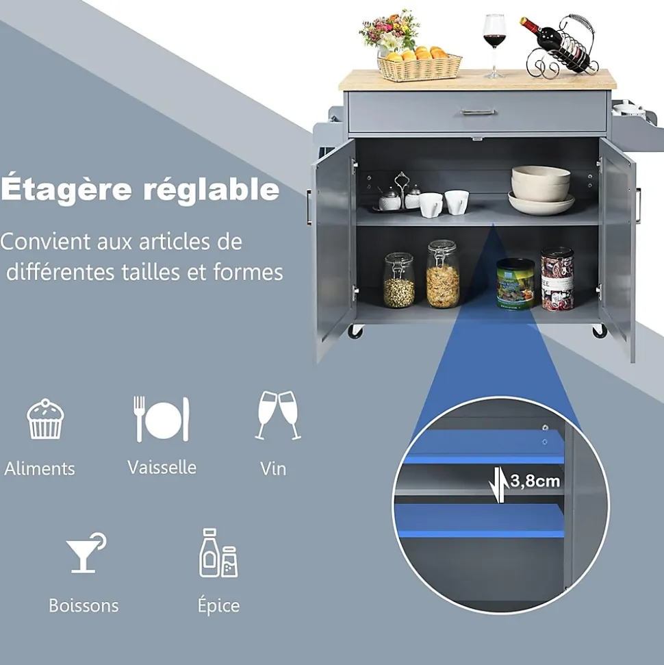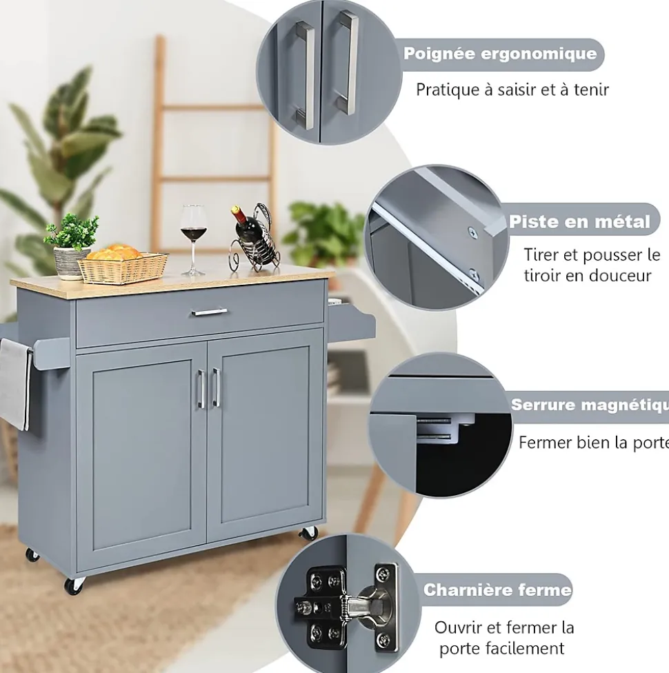 Voulez- vous cuisiner plus vite? Avez-vous peur d’avoir une cuisine en déordre? Notre chariot de cuisine vous propose une magique expérience d’utilisation. 2 étagères et 1 tiroir peuvent vous aider à placer divers articles de cuisine. Des deux côtés de chariot de cuisine se trouvent des porte-serviettes et d’étagère à épices. En outre, les étagères du placard peuvent être adaptées à la hauteur des objets. Convient à la plupart des endroit tel que la cuisine, le restaurant, le salon. En plus, il est facile d’installer à l’aide de notre notice d’instruction détaillé. Achetez maintenant et utilisez comme vous voulez!