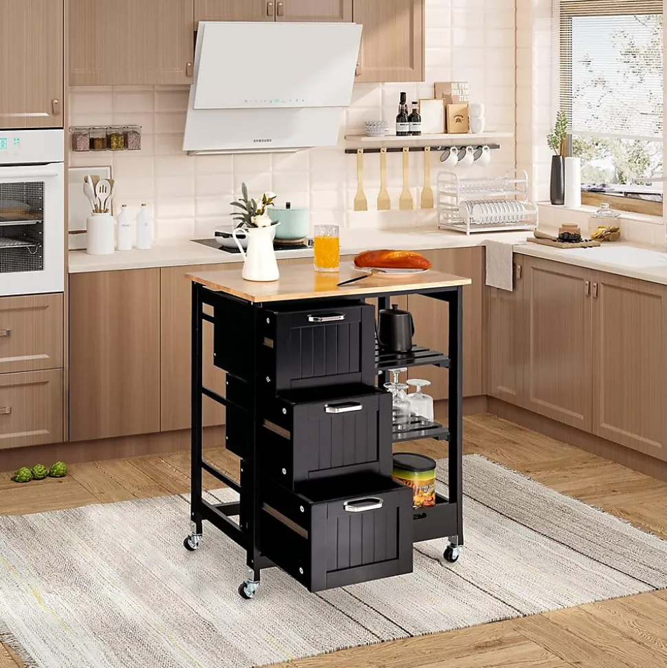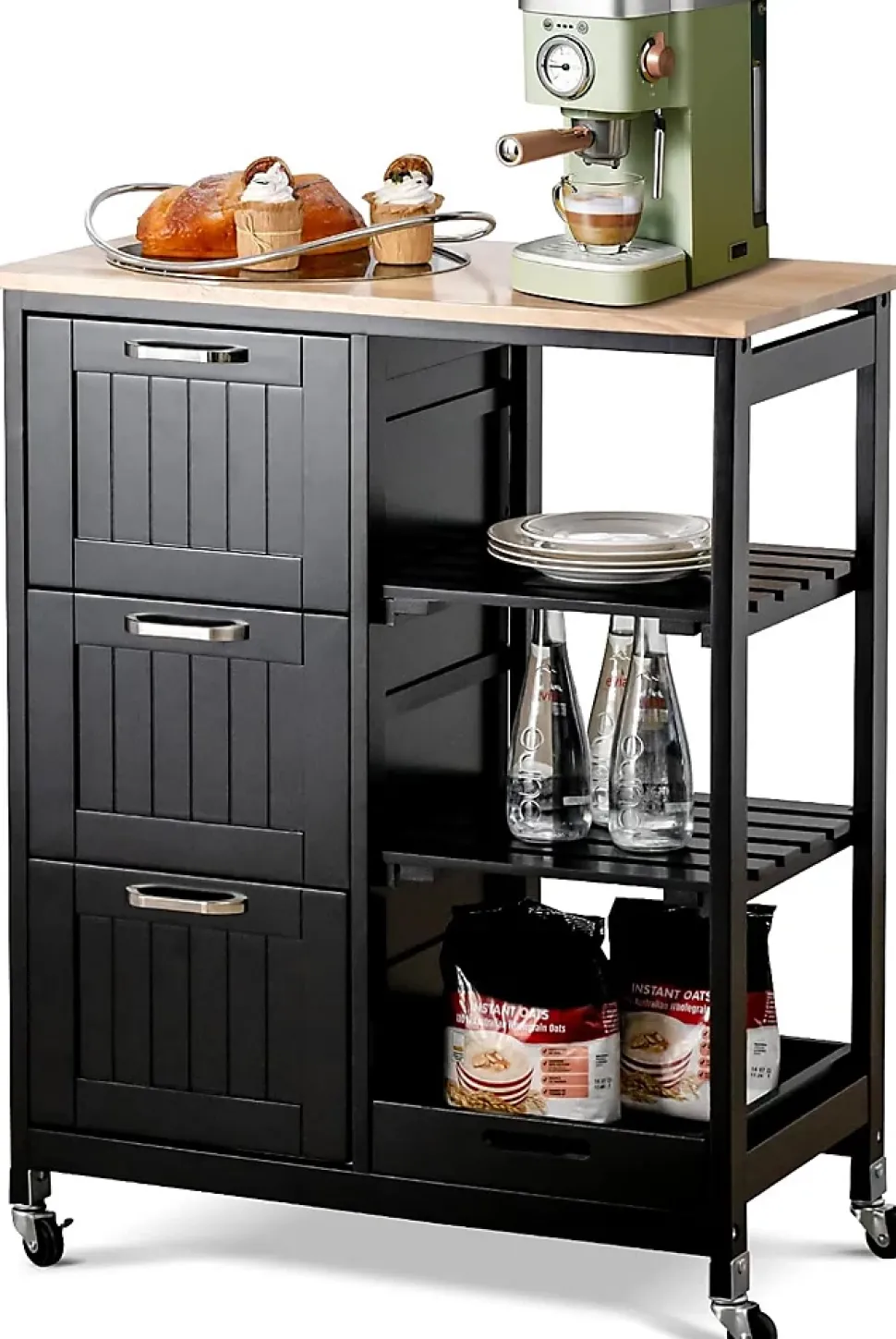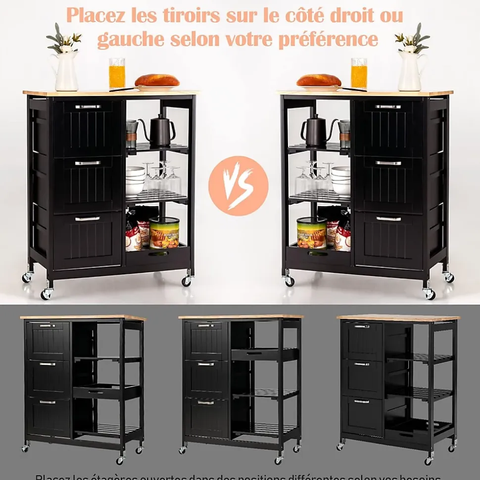 - Grand espace de rangement: Les 3 tiroirs spacieux vous permettent de trier les articles de cuisine et peuvent éviter efficacement la poussière. Les étagères ouvertes sur le côté droit et un plateau amovible vous offrent un espace de stockage supplémentaire et facilitent également l’accès aux articles.