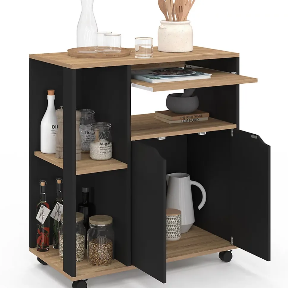 Voilà le meuble parfait pour l’optimisation de votre espace ! Organisez votre cuisine comme vous le rêviez grâce à votre nouvelle desserte. Quoi de plus tendance que le mélange noir et bois ? La desserte de cuisine COSI vous offre de nombreux rangements ! Stockez vos huiles, vinaigres, épices et bouteilles dans les deux rangements latéraux prévus à cet effet. Ses 4 roulettes, dont 2 avec frein, vous permettent de déplacer la desserte à votre guise tout en gardant à portée de main vos condiments pendant que vous cuisinez.Derrière les portes noires ultra-design de votre meuble, se cachent encore un large rangement ! Empilez toute votre vaisselle, torchons, conserves ou produits d’entretien dans cet espace fermé, très pratique pour dissimuler votre petit bazar de cuisine. Ses multifonctions ne s’arrêtent pas là ! Juste au-dessus du placard, vous trouverez une grande niche de rangement, idéal pour y entreposer vos denrées périssables.Ce meuble possède également un large plateau ainsi qu’une tablette coulissante que vous pouvez utiliser pour cuisiner ou continuer votre rangement. Outre toutes les solutions de rangement proposées, cette desserte de cuisine apporte une touche élégante et moderne à votre cuisine grâce à son côté bicolore noir et bois. Besoin de gagner de l’espace dans votre cuisine ? Laissez-vous séduire par cette desserte roulante, ultra design et fonctionnelle, qui ravivera votre déco intérieure en un tour de main !Dimensions de la desserte bois noir et plateaux façon hêtre- Dimensions totales : Longueur 76 cm x Profondeur 39,5 cm x Hauteur 85 cm- Dimensions du placard fermé : L. 53 x P. 39,5 x H.51 cm- Dimensions des étagères de gauche : L.23 x H. 40 cm- Dimensions des portes façon hêtre : L. 24,5 x H. 48 cm- Dimensions du plateau coulissant sur rail : L. 53 x P. 35 x H. 70 cm- 4 roulettes dont 2 avec frein, Hauteur au-dessus du sol : 5 cm- Panneaux de particules 15 mm, 12 mm au niveau des portes- Fond de placard en MDF de 2 mm- Coloris : bois noir et pl