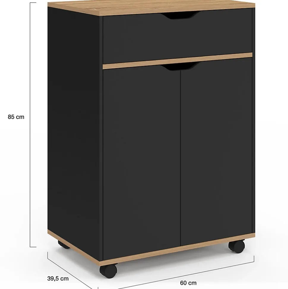 Vous avez besoin de plus de rangement dans votre cuisine ? Découvrez notre desserte de cuisine COSY avec tiroir bois noir et plateaux façon hêtre. Voilà le meuble parfait pour l’optimisation de votre espace ! Composée d’un large placard, empilez toute votre vaisselle, torchons, conserves ou produits d’entretien dans cet espace fermé, très pratique pour dissimuler votre petit bazar de cuisine. Ses multifonctions ne s’arrêtent pas là : au-dessus du placard, vous trouverez un tiroir, idéal pour y entreposer vos couverts et autres ustensiles de cuisine. Son large plateau sur le dessus, vous permettra de cuisiner ou continuer votre rangement ou d’y déposer votre micro-ondes. Dotée de 4 roulettes directionnelles, vous pouvez la déplacer très facilement, tout en gardant à portée de main vos condiments pendant que vous cuisinez.Grâce à son côté bicolore noir et bois, cette desserte apportera une touche de modernité à votre cuisine et se mariera parfaitement avec votre décoration intérieure.Besoin de gagner de l’espace dans votre cuisine ? Laissez-vous séduire par cette desserte roulante, ultra design et fonctionnelle, qui ravivera votre déco intérieure en un tour de main !Dimensions de la desserte COSY tiroir bois noir et plateaux façon hêtreDimensions globales : Longueur 60 cm x Profondeur 39.5 cm x Hauteur 85 cmDimensions intérieures du tiroir : L. 52 x P. 29 x H.14.3 cmDimensions intérieures du placard : L. 57 x P. 35 x H.59 cmÉtagère ajustable à l’intérieurPanneaux de particules de boisColoris : bois noir et plateaux façon hêtreÀ monter soi-même (visserie incluse)Retrouvez l’ensemble de nos meubles et éléments de cuisine sur notre boutique en ligne !