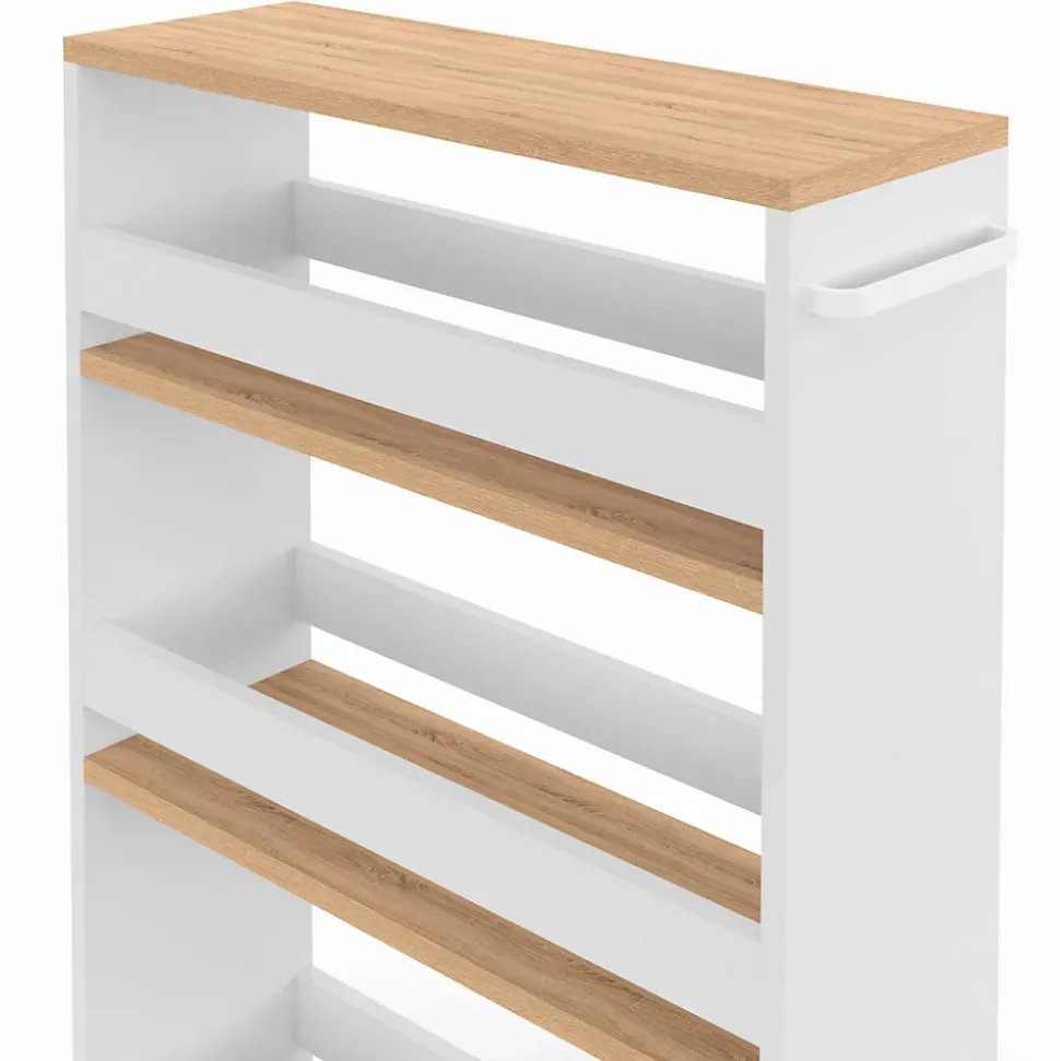 Optimisez le stockage de votre cuisine en y intégrant la desserte à roulettes HAGA gain de place ! Ordonnez vos denrées sur les 3 espaces de la desserte. L’espace le plus bas, de 27,5 cm de hauteur est idéal pour ranger vos huiles, vinaigres et petites bouteilles.Placez vos épices et condiments sur les deux autres étagères de 24 et 17,7 cm de hauteur. Chaque espace de stockage est sécurisé par des renforts latéraux pour assurer la stabilité de votre rangement. Avec ses 16 cm de largeur, glissez le range-épices entre votre cuisine et votre frigidaire, pour un espace de stockage optimisé. Faites coulisser le range-épices en toute facilité, comme un élément de cuisine à part entière, tirez pour accéder à son stockage et poussez pour occulter son stockage. Plus d’hésitation, ajoutez du rangement à votre cuisine à petit prix ! Dimensions de la desserte de cuisine gain de place HAGADimensions globales : Longueur 47 x largeur 16 x Hauteur 80 cmDimensions des étagères du bas vers le haut : H. 27,5 cm – 24 cm – 17,7 cm4 roues Matériaux : Panneaux de particules et MDF Coloris : Blanc et façon hêtreÀ monter soi-mêmeRetrouvez l’ensemble de nos dessertes de cuisine sur notre boutique en ligne !