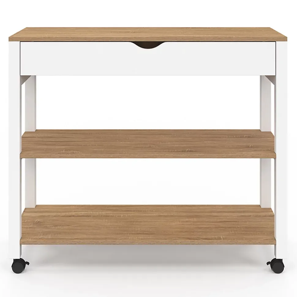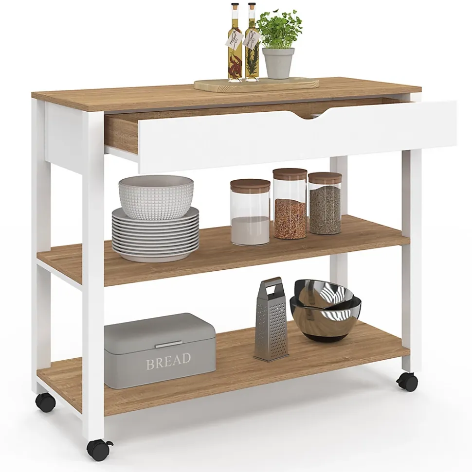 Organisez votre cuisine et optimisez vos espaces de stockage et de rangement grâce à la desserte de cuisine PENH ! Profitez sans plus attendre de ses deux étagères de stockage pour entreposer vos plats, livres de cuisine, conserves et autres indispensables de la cuisine ! La desserte à une hauteur parfaite pour pouvoir utiliser son plateau comme plan de travail. Posez votre plat et concoctez de bons petits plats tout en gardant vos condiments à portée de main !Utilisez le large tiroir pour entreposer tous vos couverts et autres ustensiles de cuisine. Hyper pratique, ce tiroir vous permet de ranger votre équipement de cuisine à l’abri des regards.Avec ses 4 roulettes, dont 2 avec frein, vous pouvez déplacer la desserte à votre guise. Outre son rangement, cette desserte apporte une touche élégante et moderne à votre cuisine grâce à son côté bicolore blanc et bois. Envie de gagner de l’espace dans votre coin cuisine ? Choisissez la desserte roulante PENH, ultra design et fonctionnelle, qui ravivera votre déco intérieure en un tour de main !Dimensions de la desserte PENH XXLDimensions globales : Longueur 100 x largeur 40 x Hauteur 85 cm Dimensions intérieures du tiroir : L.87.5 x l.28.5 x H.6.5 cmDimensions de la façade du tiroir : L.92 x H.12 cmHauteur des étagères : 29.5 cmHauteur du sol à la première étagère : 10.5 cmMatériau : panneaux de particules4 roulettes dont 2 avec freinColoris : blanc et bois façon hêtreVisserie incluse À monter soi-mêmeRetrouvez l’ensemble de nos dessertes de cuisine sur notre boutique en ligne !