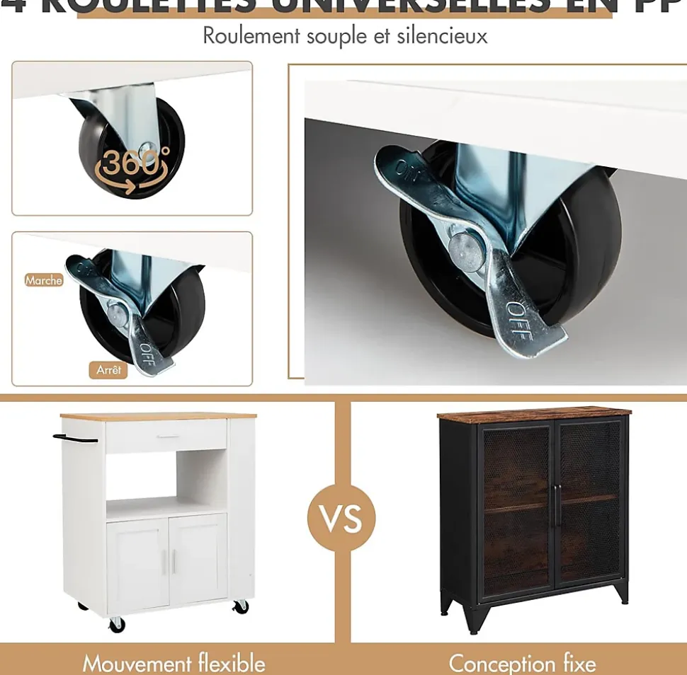 - Facile à déplacer: Ce chariot de cuisine a 4 roues flexibles qui vous permettent de le déplacer facilement. Les deux roues de frein facilitent également la fixation du chariot de cuisine et l’empêchent de glisser. La conception compacte rend ce chariot de cuisine également adapté aux espaces restreints.