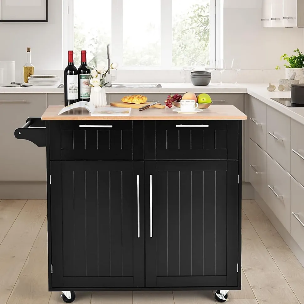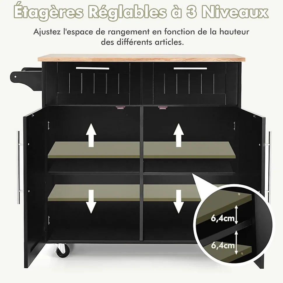 Cet desserte de cuisine comprend un porte-serviettes, des tiroirs spacieux et un espace de rangement fermé avec des étagères. Fabriqué à partir de bois d’hévéa de haute qualité et de matériaux MDF, le chariot de cuisine est robuste et durable. De plus, 4 roues vous aident à déplacer facilement le chariot. 2 des roues avec freins d’urgence vous permettent de le verrouiller en position sans craindre qu’il ne roule. Son élégant plateau en bois améliore son attrait esthétique général, l’installant dans la salle à manger, la cuisine, le bar, le restaurant, etc.