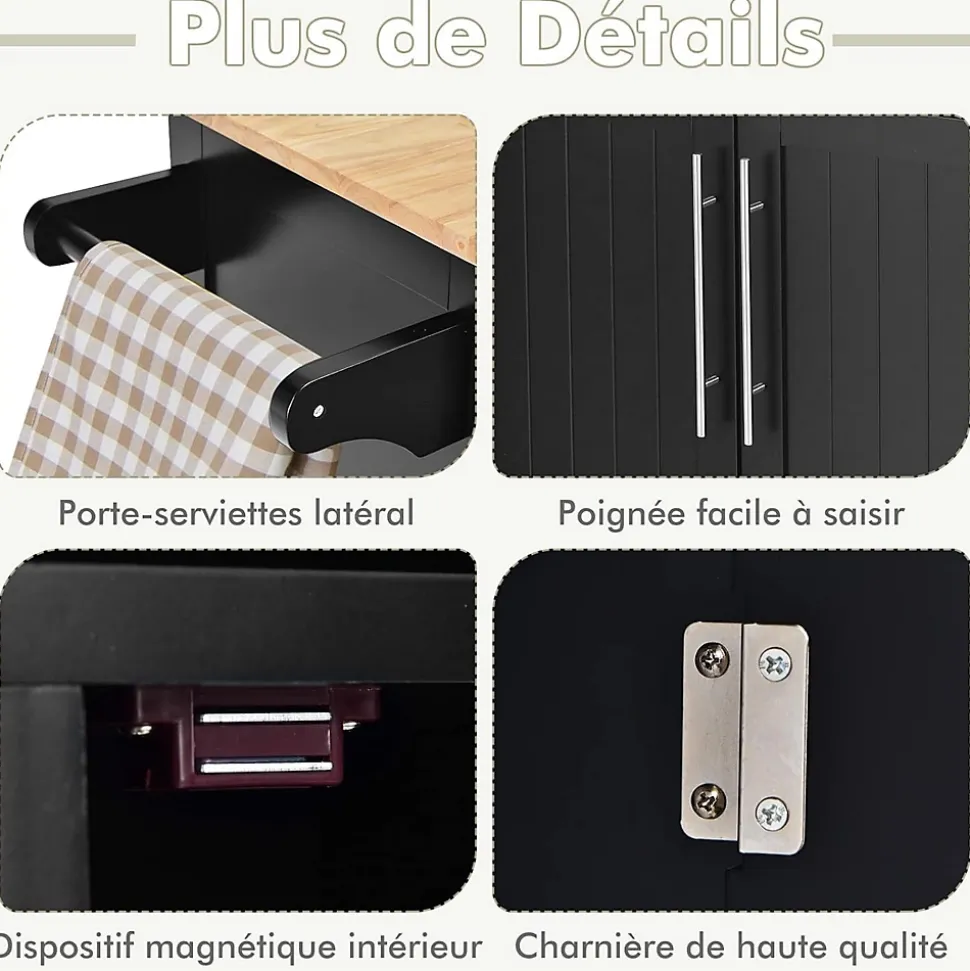 - Stockage pour la présentation et le rangement : Un grand comptoir en bois pour exposer les fruits, les légumes, les épices, etc. Et 2 tiroirs profonds et de 2 grands placard fermés pour organiser différentes tailles d’ustensiles de cuisine.