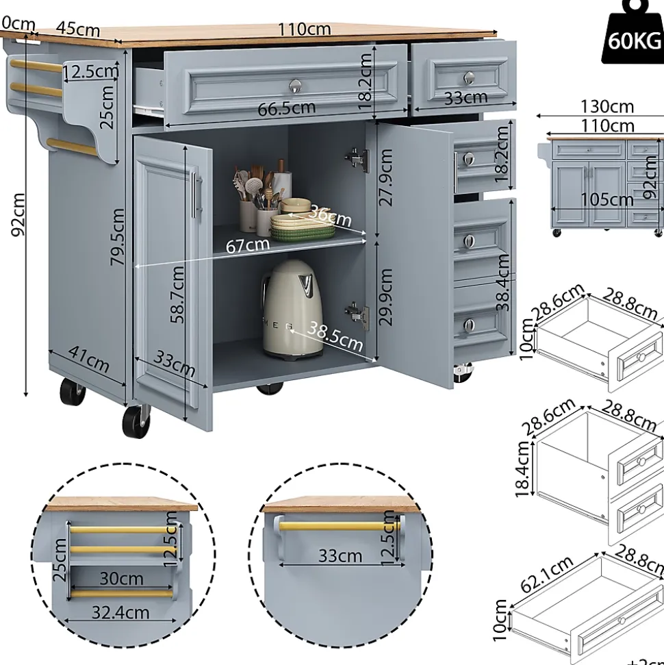 ▶ ▶ Détails ▶────────────────✦ Type de produit : Buffet de cuisine✦ Couleur : Bleu✦ Dimensions totales (déplié) : 110 x 75 x 92 cm (L x l x H)✦ Dimensions totales (replié) : 110 x 45 x 92 cm (L x l x H)✦ Poids du produit : 47,5 kg✦ Matériau : Métal + MDF✦ Capacité de charge : 60 kg✦ Assemblage requis : Environ 30 minutes✦ Contenu de la livraison : 1 îlot de cuisine + pièces de montage✦ Nombre de colis : 2► Remarques ►※ En raison de mesures manuelles, une marge d’erreur de 2–3 cm peut survenir.※ Toutes les photos sont prises à partir de produits réels, mais des différences de couleur peuvent apparaître en raison de la lumière du soleil ou d’autres facteurs.※ Ce produit est expédié en 2 colis. Ils peuvent ne pas arriver en même temps. Merci de votre patience.※ La longueur de l’armoire correspond à la valeur avant et la largeur à la valeur latérale. Veuillez vous référer aux images pour plus de précision.