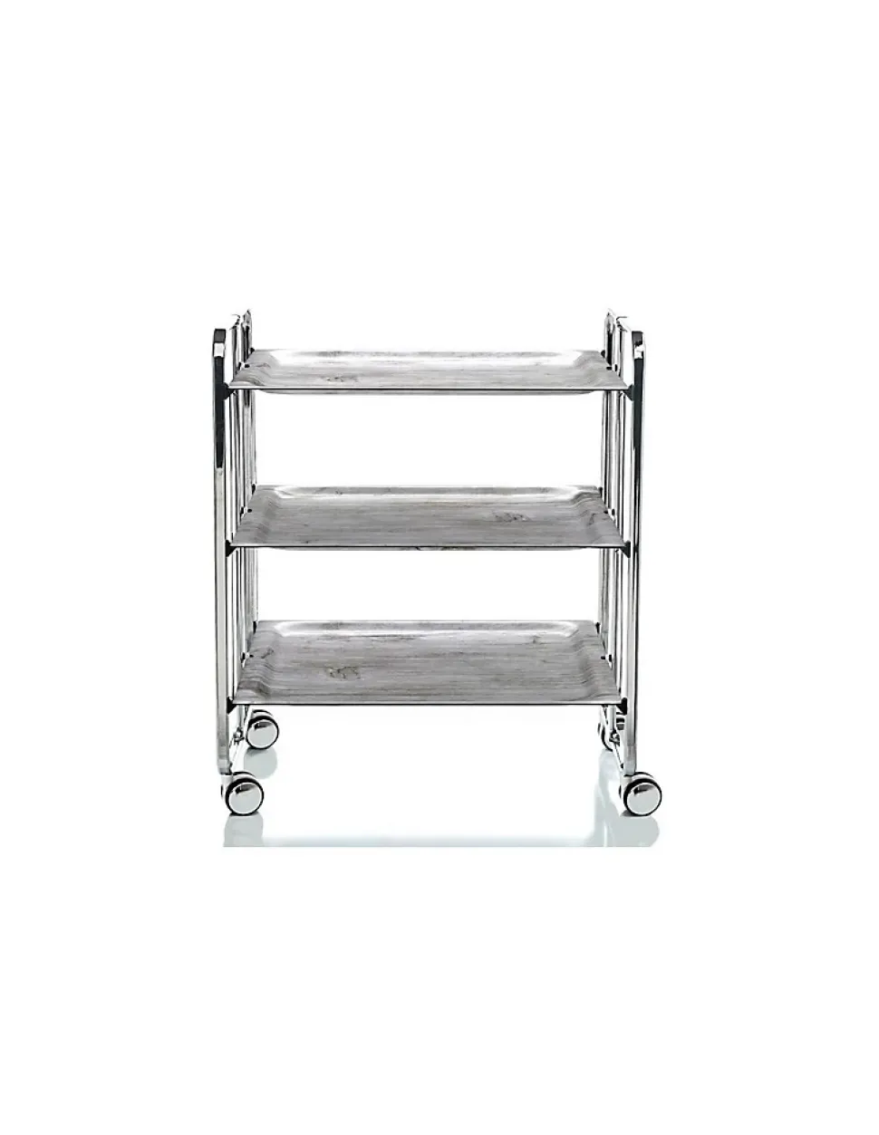 Desserte pliante BAUHAUS chromée avec roulettes – 3 niveaux et 3 positionsLa desserte pliante BAUHAUS chromée 3 niveaux associe design contemporain et savoir-faire européen. Sa structure métallique chromée avec finition transparente qui met en valeur son éclat naturel lui confère une allure élégante et professionnelle.Grâce à ses 3 plateaux en stratifié décoratif, cette desserte offre un espace généreux pour ranger, présenter ou servir avec style. Idéale pour la cuisine, le bar, le restaurant ou le bureau, elle conjugue esthétique moderne et confort d’usage.Design fonctionnel et grande capacitéSon système de 3 positions réglables — ouverte, semi-fermée et pliée — permet d’adapter la desserte à chaque besoin. Ses 3 niveaux de rangement offrent une surface pratique tout en se repliant facilement pour économiser de l’espace.3 plateaux spacieux pour ranger, servir ou exposer.3 positions réglables pour un usage modulable.Roulettes pivotantes pour une mobilité fluide et silencieuse.Structure métallique chromée avec finition transparente qui met en valeur son éclat naturel.Plateaux décoratifs en stratifié, faciles à nettoyer et adaptés à un usage quotidien.Matériaux sélectionnés pour leur fiabilité et leur usage fréquent.Livrée montée et prête à l’emploi.Dimensions approximativesOuverte : 82 cm (H) × 66 cm (L) × 43 cm (P) Pliée : 96 cm (H) × 71 cm (L) × 9 cm (P) Distance entre les plateaux : 26 cmStyle professionnel et design moderneSa finition chromée reflète la lumière et apporte une touche lumineuse à tout espace. Élégante et pratique, la desserte BAUHAUS chromée trouve sa place aussi bien à la maison que dans un cadre professionnel, du salon au bar ou à la réception.Fabrication espagnole et contrôle soignéFabriquée en Espagne selon un processus rigoureux. Chaque pièce est vérifiée individuellement pour garantir une utilisation fiable.Une desserte pliante au design épuré, pensée pour un usage quotidien.Grande capacité · Design fonctionnel · Fabrication espagnole