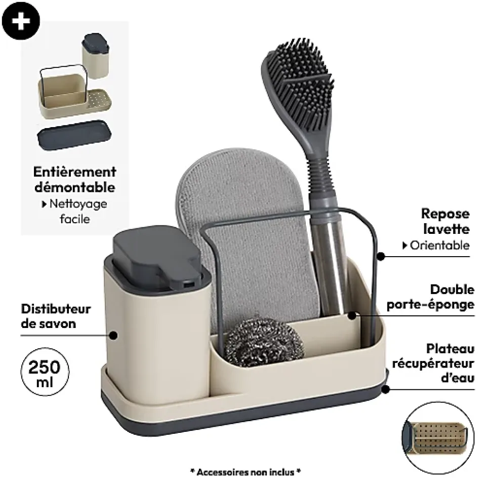 Distributeur à savon « Néo » beigeContenu : 1 porte éponge – 1 distributeur de savonDimensions : L. 21.8 x P. 13.7 x H. 14 cmColoris : BeigeMarque : 5 five simply smart