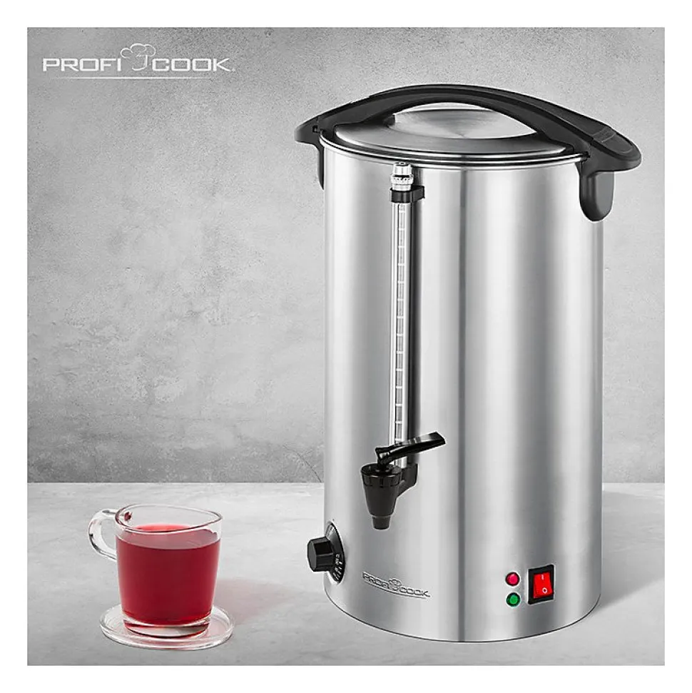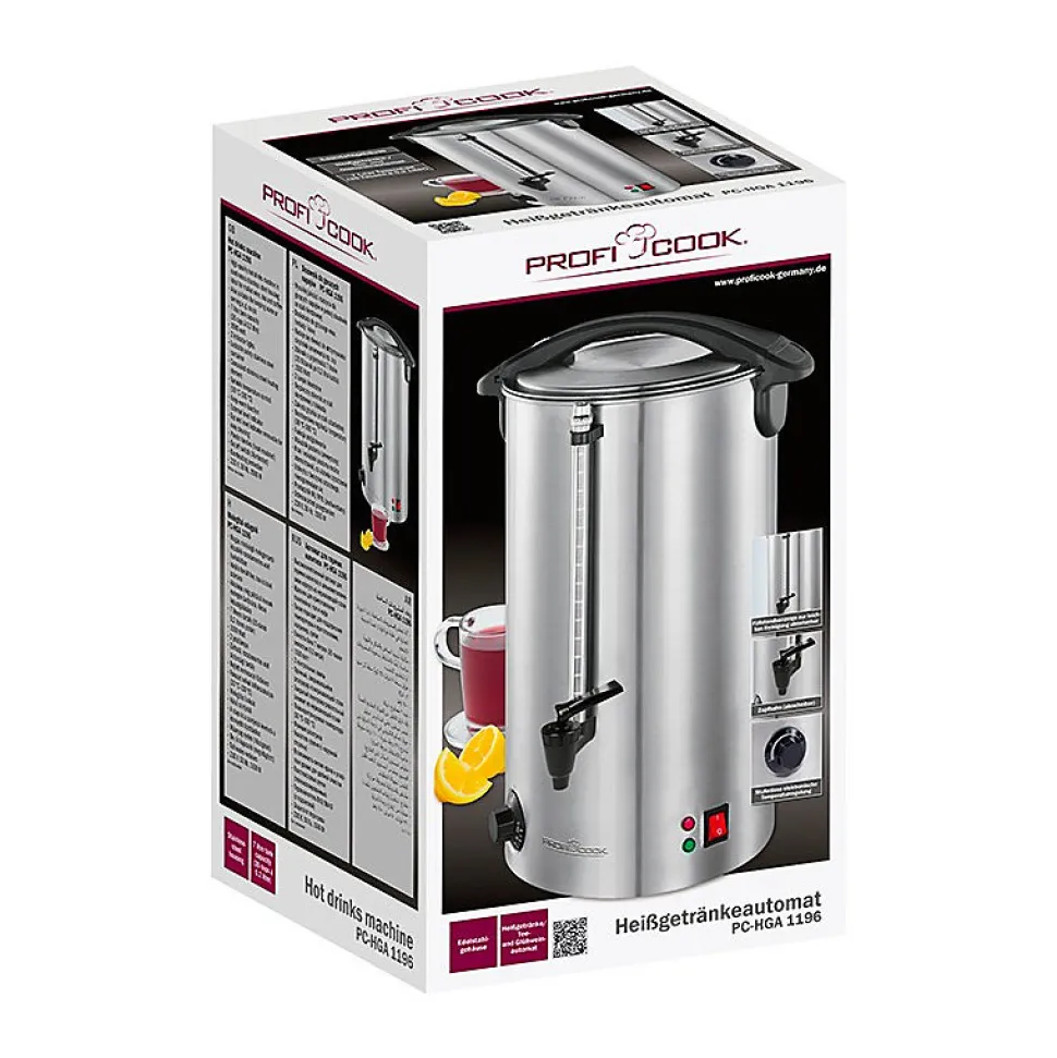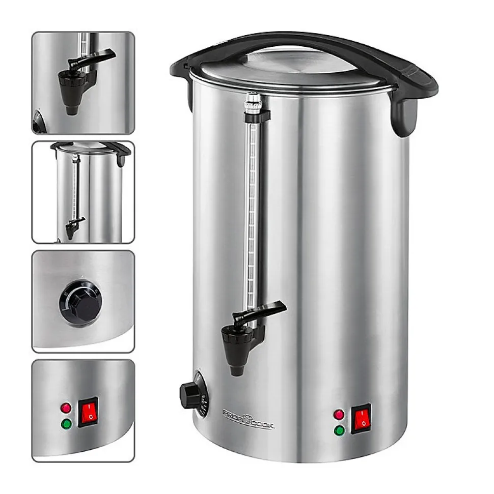 – Machine à boissons chaudes de haute qualité dans un boîtier continu en acier inoxydable- Idéal pour le vin chaud, le thé et le café- Convient également pour garder au chaud ou servir par ex. soupes- Capacité du réservoir de 7 litres (35 tasses à 0,2 litre- 1500 watts- 2 voyants lumineux- Conteneur de sécurité en acier inoxydable verrouillable- Élément chauffant dissimulé en acier inoxydable- Contrôle de température électronique variable (30 ° C – 100 ° C)- Fonction de maintien au chaud- Indicateur de niveau externe- Indicateur de niveau Tap + amovible pour un nettoyage facile- Poignées en plastique (isolées thermiquement)- Interrupteur marche / arrêt (éclairé)- Protection contre la surchauffe- 230 V, 50 Hz, 1500 W