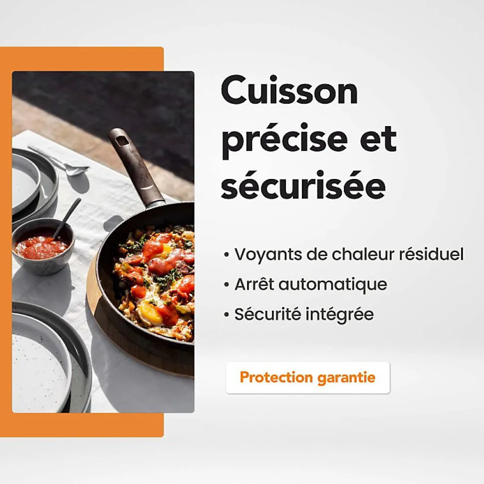 - « Les plus » : 2 voyants de chaleur résiduelle – Sécurité coupe circuit 120 minutes – Sécurité défaut électrique. Plaque compatible pour installation électrique 16 Ampères grâce à sa gestion de puissance limitée à 3300 Watts
