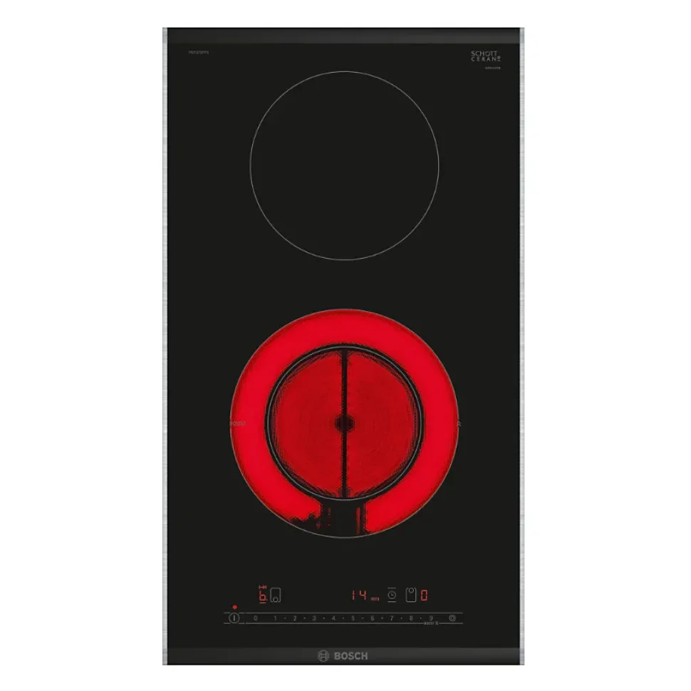 Domino vitrocéramique 30cm noir Bosch – Domino vitrocéramique Série 6 PKF375FP2E de bosch rend la cuisine et le nettoyage plus facile. DirectSelect : accès direct à la zone de cuisson désirée, aux puissances et autres fonctions additionnelles. Comfort-design : design élégant et séduisant avec facettes inox latérales et face avant biseautée. Domino fonctionnel de 30 cm de large. PowerBoost : votre plaque électrique fournit jusqu’à 20 % d’énergie en plus. Timer avec fonction arrêt : désactive la zone de cuisson selectionnée une fois le temps programmé arrivé à échéance. – Type de produit : Domino vitrocéramique.Pose-libre / Intégré : Encastrable.Source d’énergie : Électricité.Nombre de foyers pouvant être utilisés simultanément : 2.Témoin de chaleur résiduelle : Indépendant.Emplacement du bandeau de commande : Devant de la table.Matériau de base de la surface : Vitrocéramique.Couleur de la surface : Alu., brossé, Noir.Longueur du cordon électrique : 100 cm.Puissance maximum de raccordement : 3500 W.Intensité : 16 A.Tension : 220-240 V.Fréquence : 50, 60 Hz.Sécurité enfants.Sécurité surchauffe.Système de commande : Bandeau DirectSelect.Zone de cuisson flexible : Two-ring cooking zone.Minuterie : Oui.Positions de réglage de la zone chauffe-plat : 17 positions de réglage .Câble de raccordement : 1 m.Taille de niche requise pour l’installation (HxLxP mm) : 38 x 270 x (490 – 500).Dimensions du produit (HxLxP mm) : 38 x 306 x 527.Poids net : 4,5 kg.
